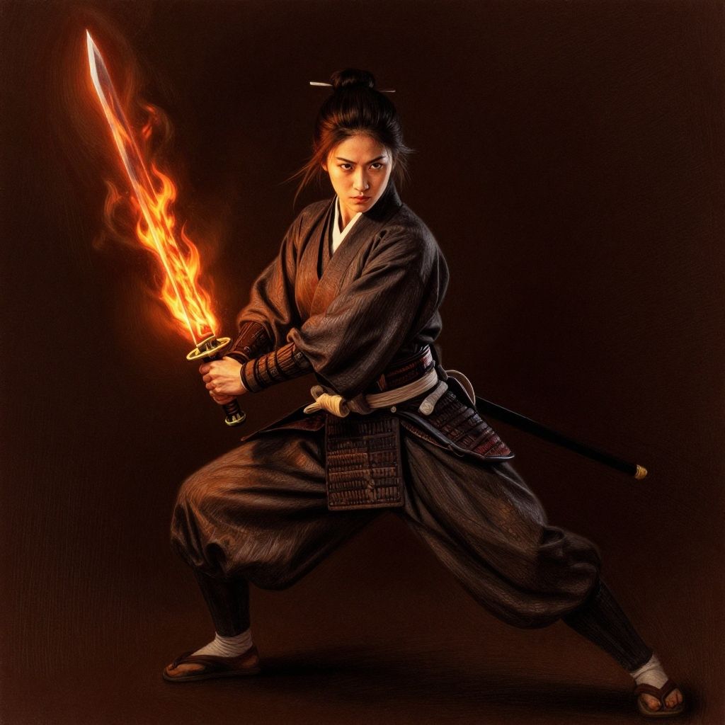 Ultra realistic full body color pencil drawn portrait of a female Japanese warrior, in a battle pose, holding a flaming sword, Deep dark intense brown background, Dark theme, dynamic lighting, (soft shadows), (soft focus), (photo realistic), uhd, 8k
