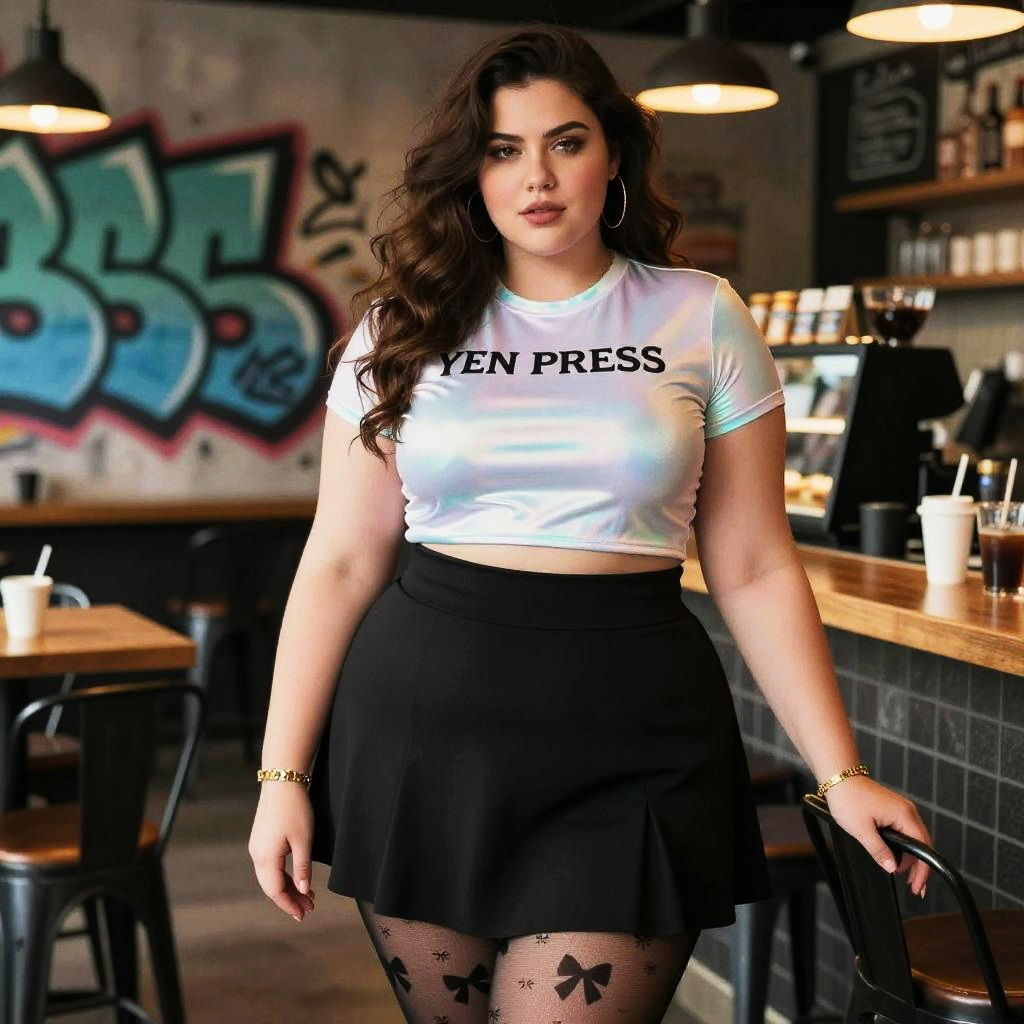 A Plus-size woman in a Yen Press style, wearing an iridescent cropped t-shirt and a high-waisted black skater skirt, stands in a trendy coffee bar adorned with urban graffiti. She pairs her outfit with sheer tights featuring bow patterns and a gold bracelet, exuding a casual yet stylish vibe. Sexy. Pretty face and beutiful eyes