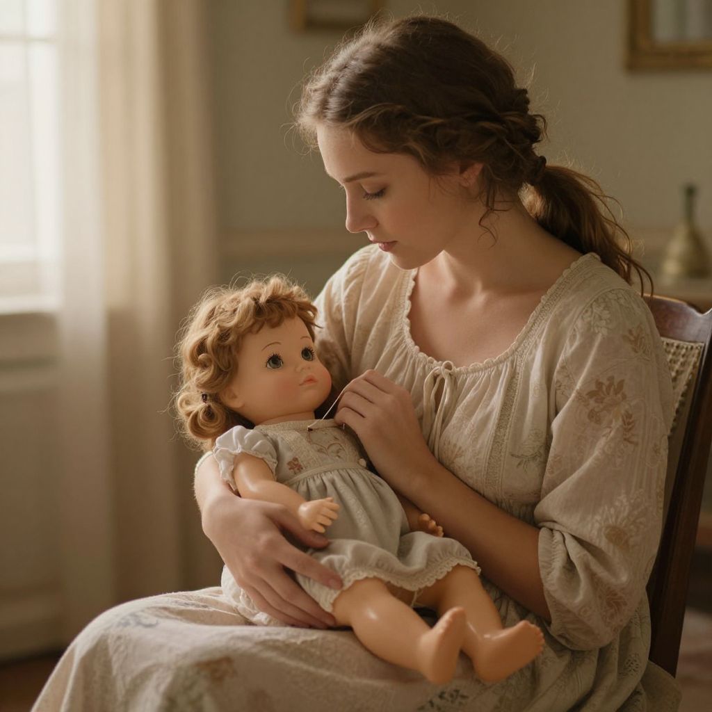 In a quiet room bathed in soft, golden light, a tender moment unfolds as a woman cradles a doll, her gentle touch weaving a thread of connection between past and present, evoking a profound sense of maternal love, nostalgia, and the timeless bond between creator and creation.