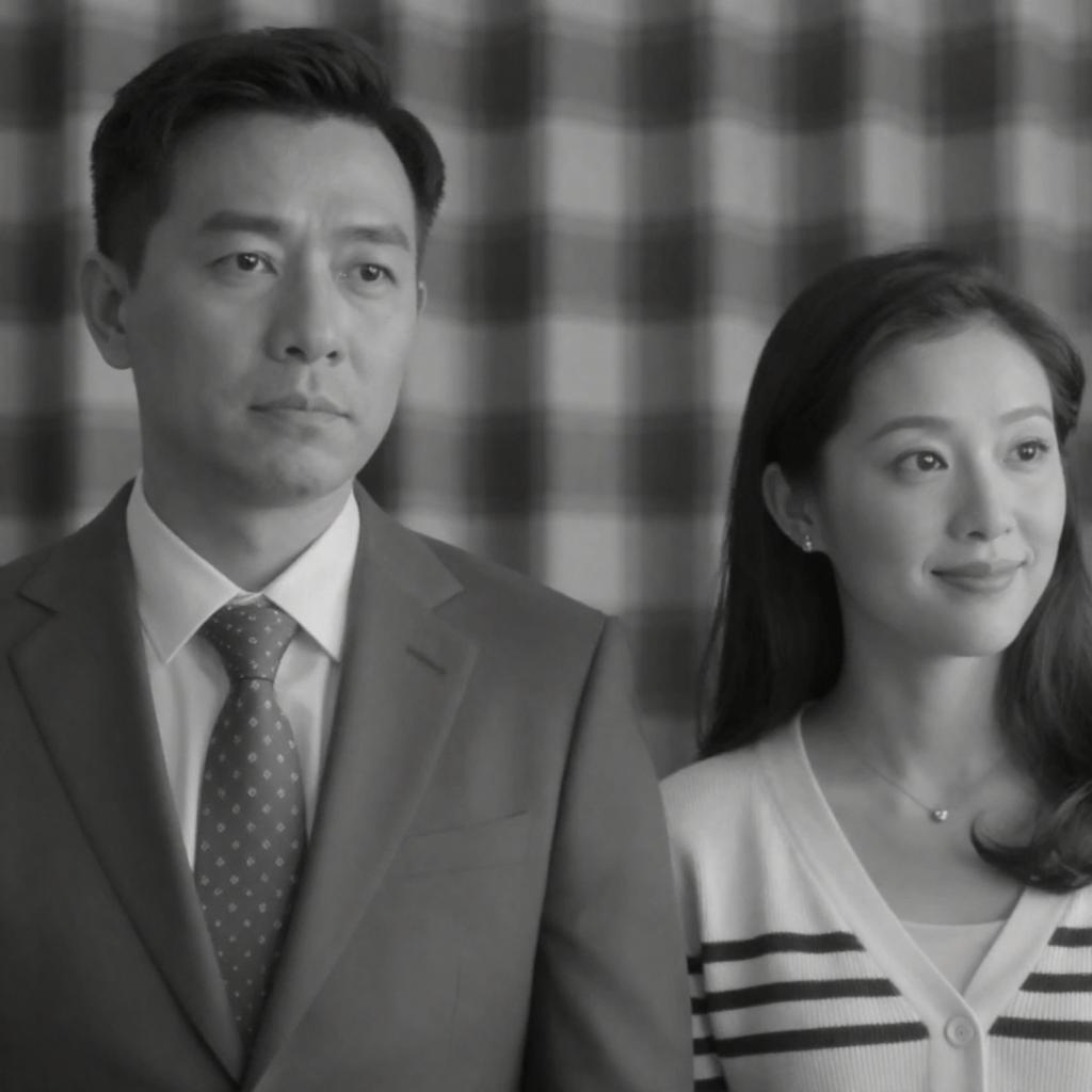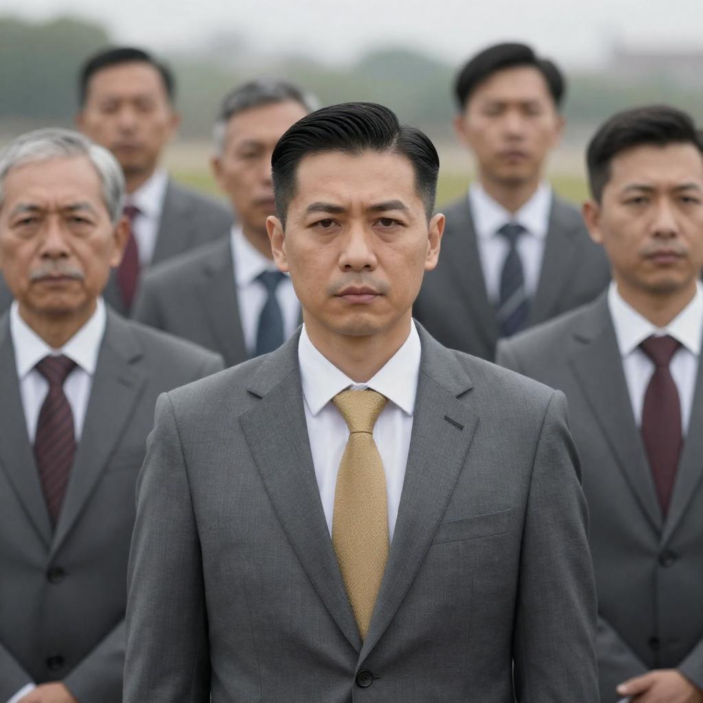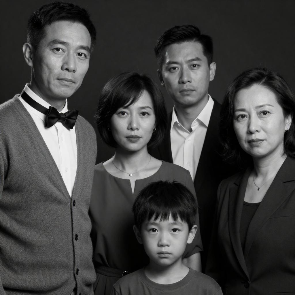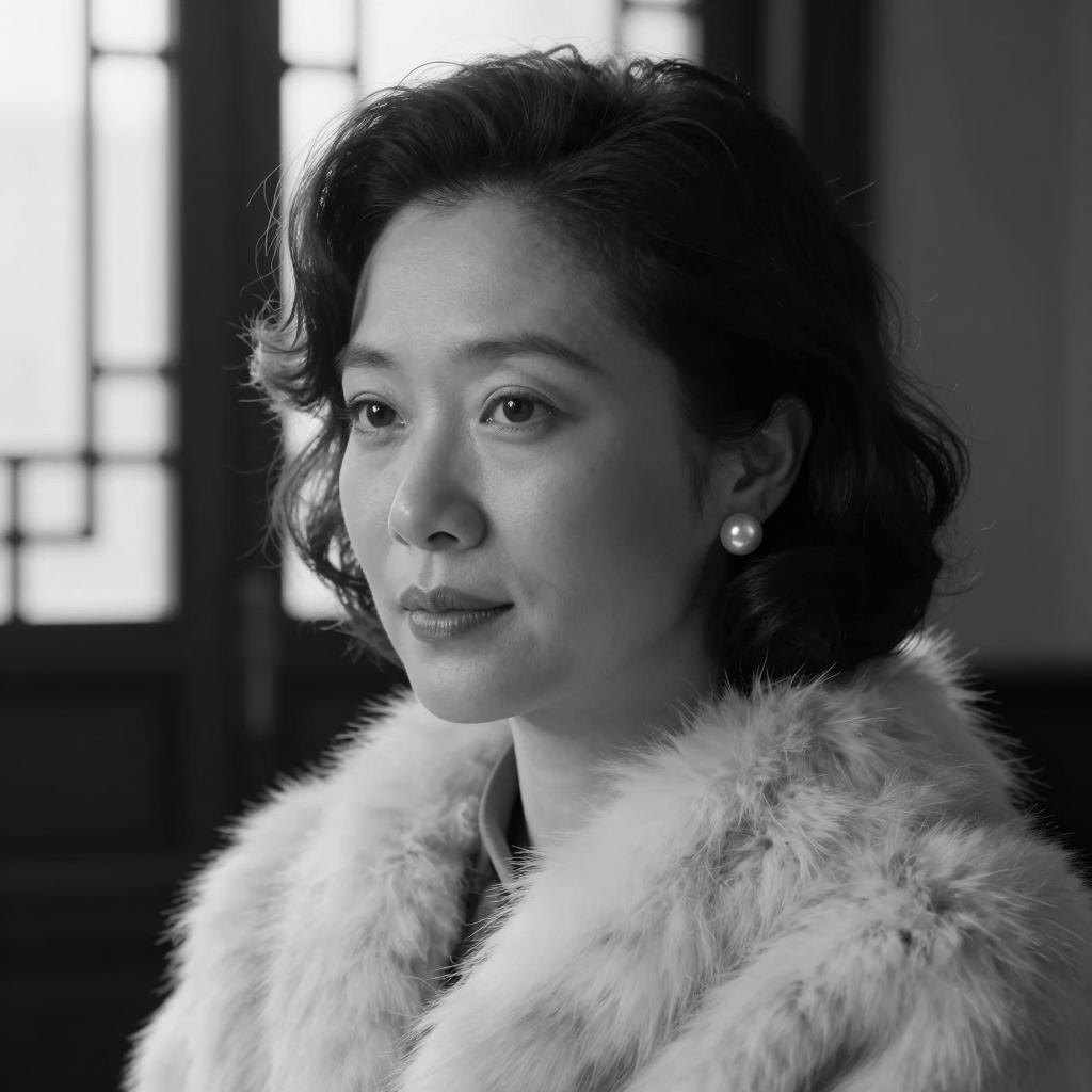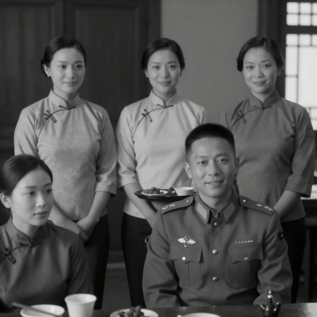 Black-and-white photograph of five Asian individuals in a dimly lit room. Three women with dark hair, traditional dresses, and modest smiles stand behind a table. One man in a military uniform with buttons, dark hair, and a slight smile sits at the table. Another woman with dark hair, leaning forward, partially visible. The background shows wooden panels and a window with light. The man holds a pipe, the woman in the center holds a tray with small dishes. All individuals have soft, calm expressions.