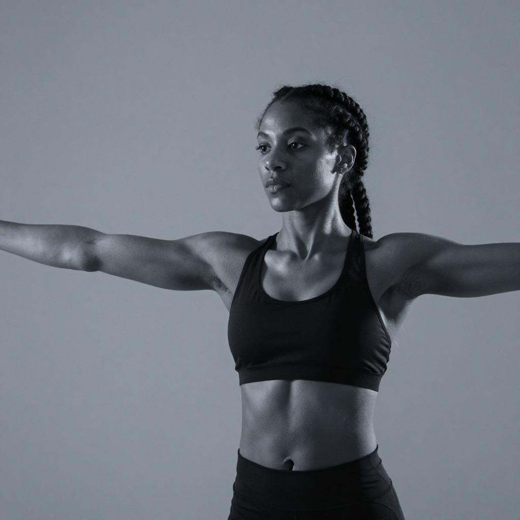 Photograph of a muscular Black woman with braided hair, wearing a black sports bra, standing against a ured gray wall. She has her arms outstretched, showcasing her defined abs and toned arms. The image is in blue monochrome, highlighting her athletic physique.