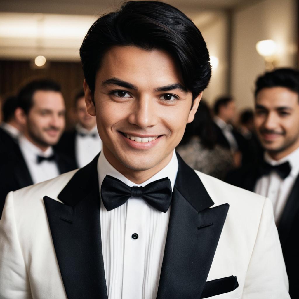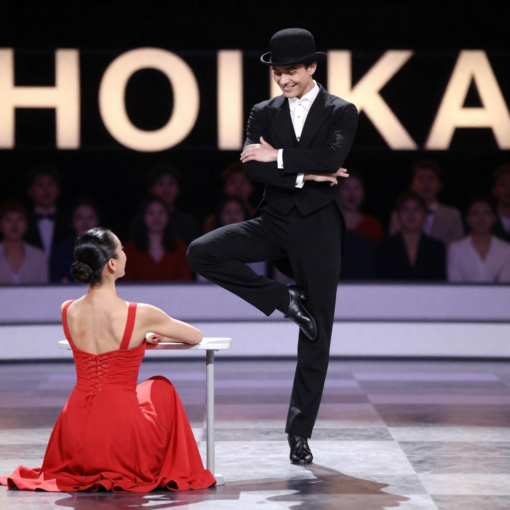 Man in black suit, white shirt, black hair, mid-dance, laughing, illuminated stairs background, woman in red dress, blonde updo, seated, blurred audience, dim lighting, stage, energetic atmosphere.