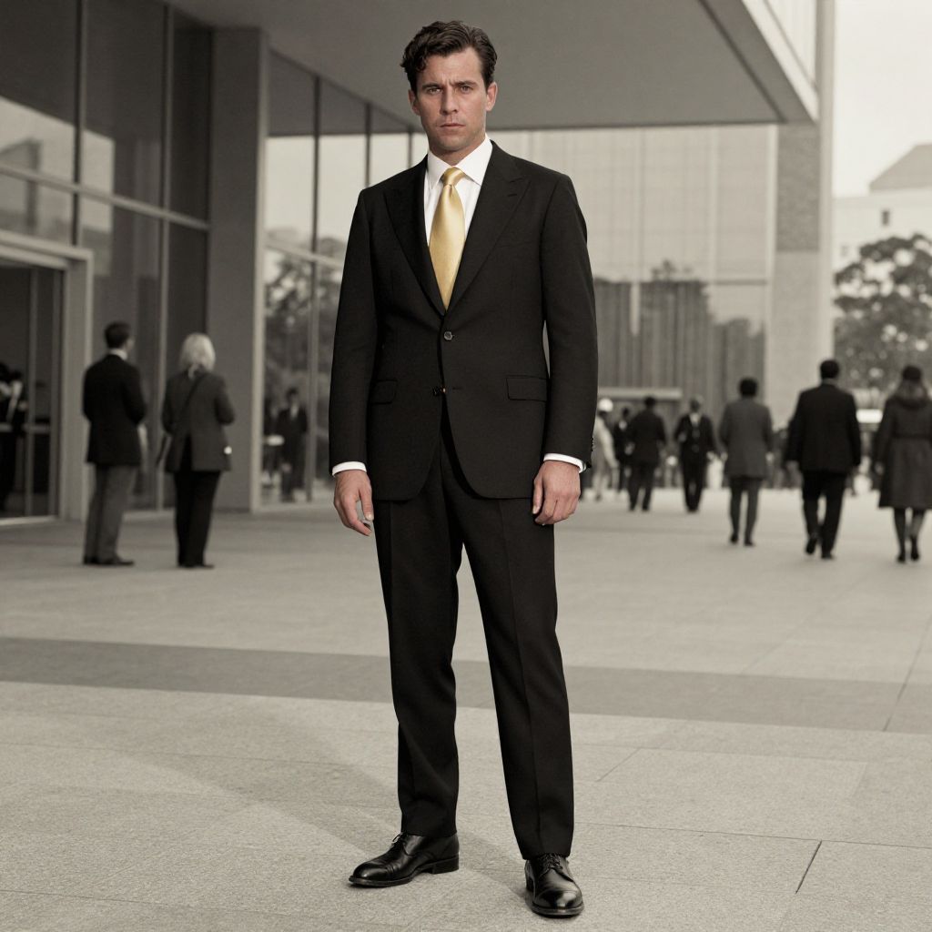 A man, tailored black suit, crisp white dress shirt, luxurious gold silk tie, polished black leather oxford shoes, modern architecture, large glass windows, bustling shoppers, hand-tinted photograph, confident expression. Man has masculine face and piercing eyes