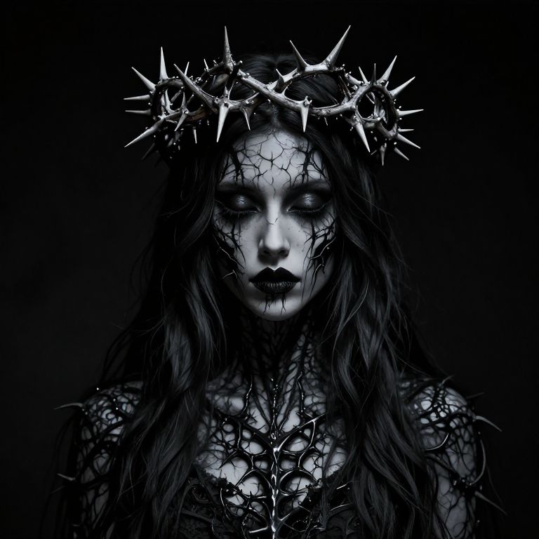 Gothic digital artwork of a pale woman with dark, cracked makeup, long black hair, and a spiked crown, set against a black background.