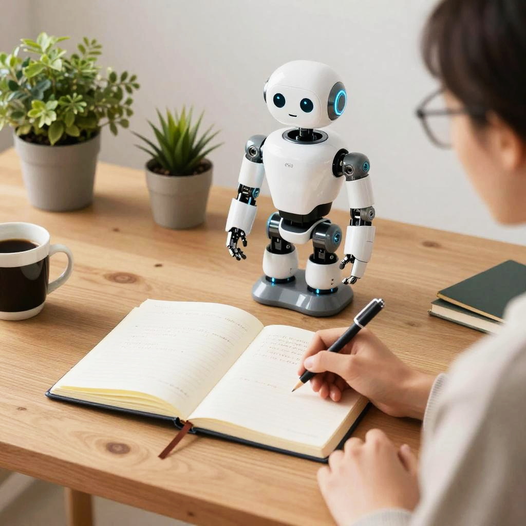 A creative workspace featuring a journal generator robot assisting a person by writing unique journal entries, warm natural lighting, modern minimalist desk with plants and coffee, emphasizing creativity and productivity in a contemporary digital art style