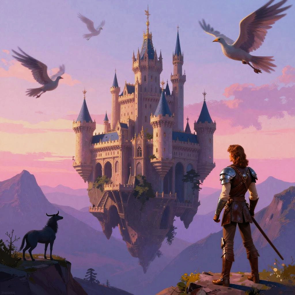 Movie poster generator depicting a whimsical fantasy adventure with a magical castle floating above clouds, mythical creatures like dragons and fairies flying around, bright pastel colors, ornate gold lettering, and a heroic young protagonist holding a glowing sword