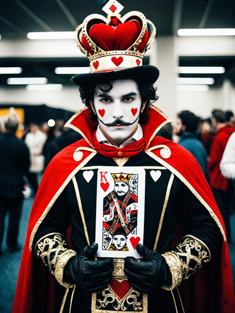 Man in King of Hearts Costume, cosplay festival photo, photorealistic realism