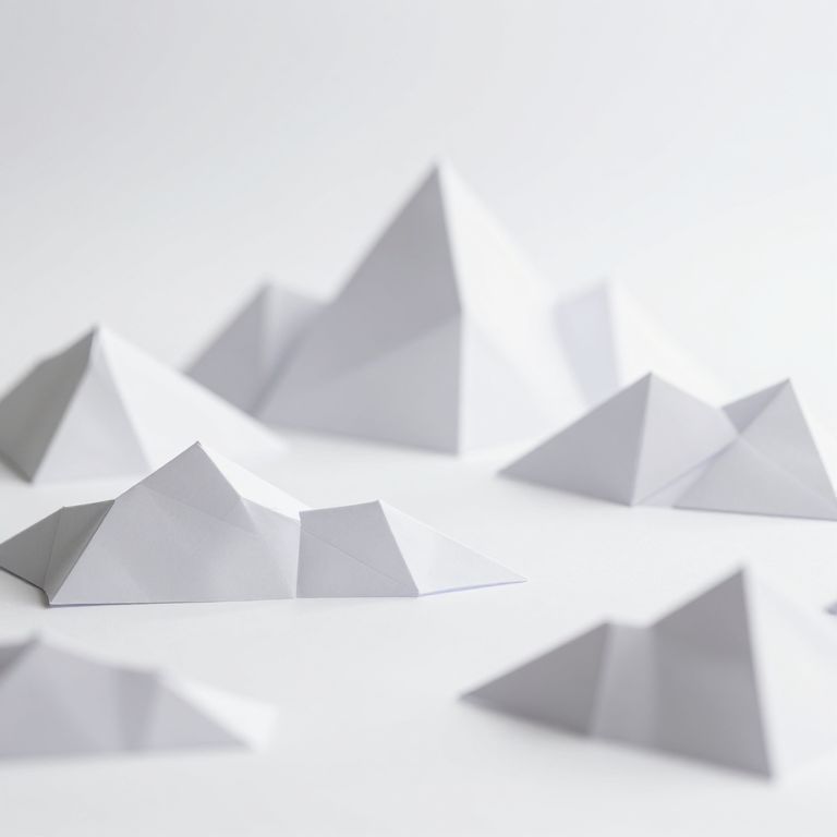 Origami mountains rise from a pristine white expanse, their geometric peaks and valleys defying natural contours in a surreal landscape crafted by the artistry of paper and imagination.