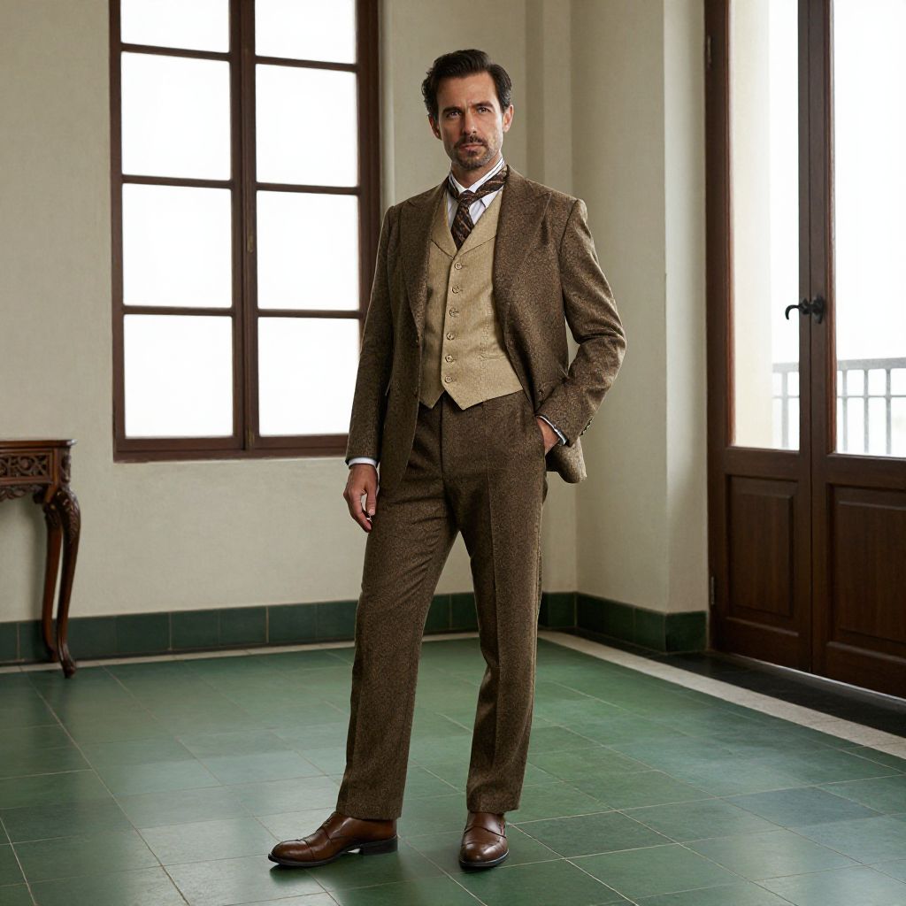 Photograph of a handsome, bearded man in a brown tweed suit, cream waistcoat, and tie, standing confidently in a brightly lit,