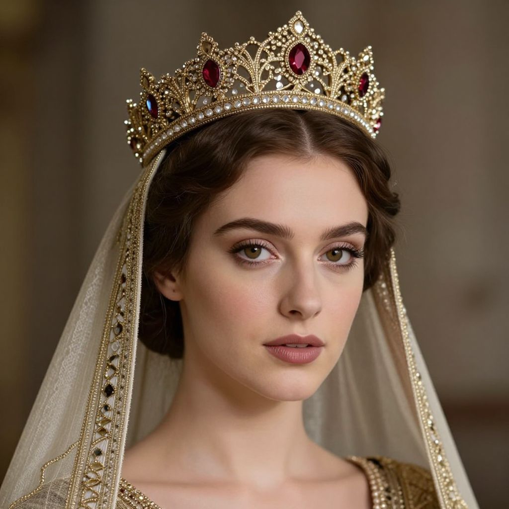 Medieval princess headdress, a close up of a woman wearing a crown and a veil