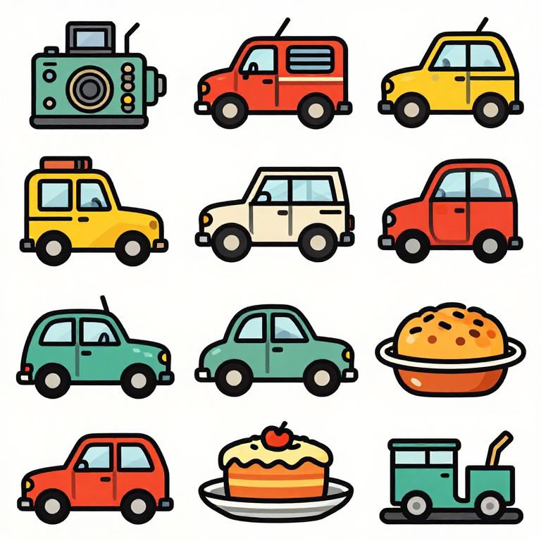 This is a colorful, digital illustration featuring a 3x4 grid of cartoon-style car and food icons. The cars, depicted with simple, bold outlines and flat colors, include red, yellow, green, and white models, each with distinct shapes and minimal detailing. The food icons include a round, dotted orange bun, a slice of layered cake with a cherry on top, and a green food truck. The cars are arranged in the top four rows, and the food icons are in the bottom row. The background is white, emphasizing the vibrant, playful colors and simple, whimsical design.