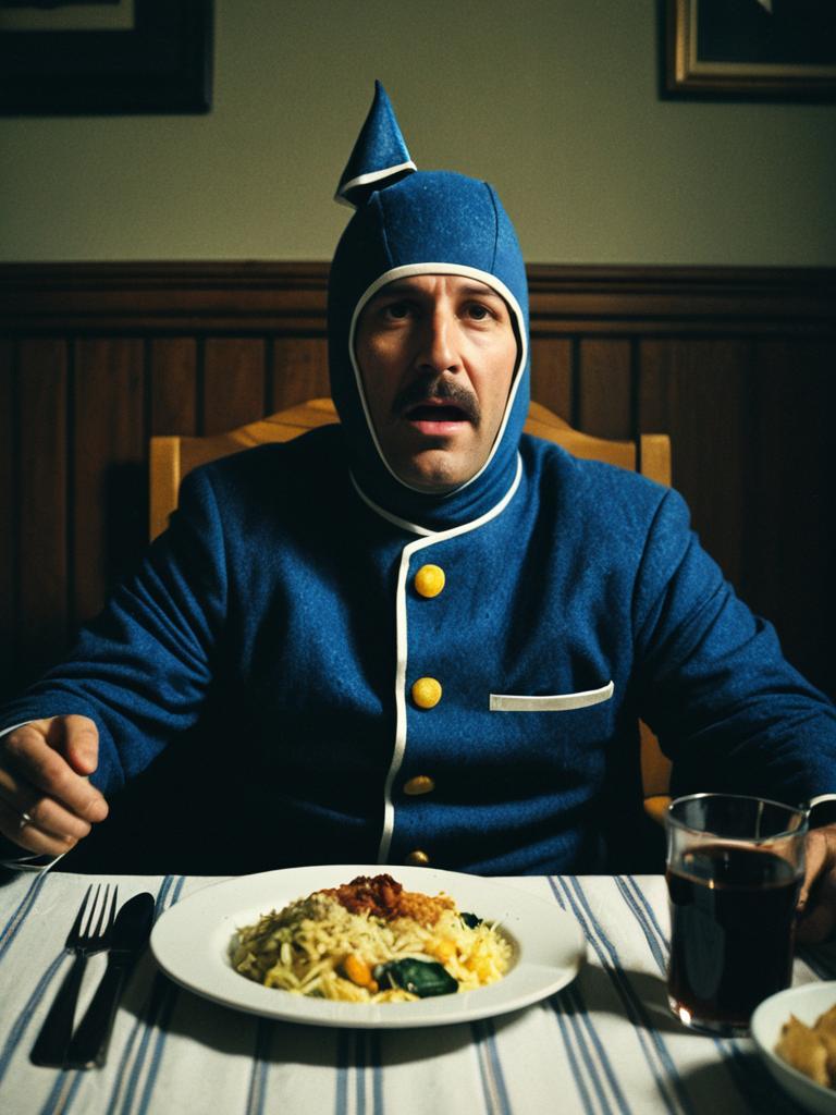 Man in Supper costume, cinematic realism, humorous editorial photo
