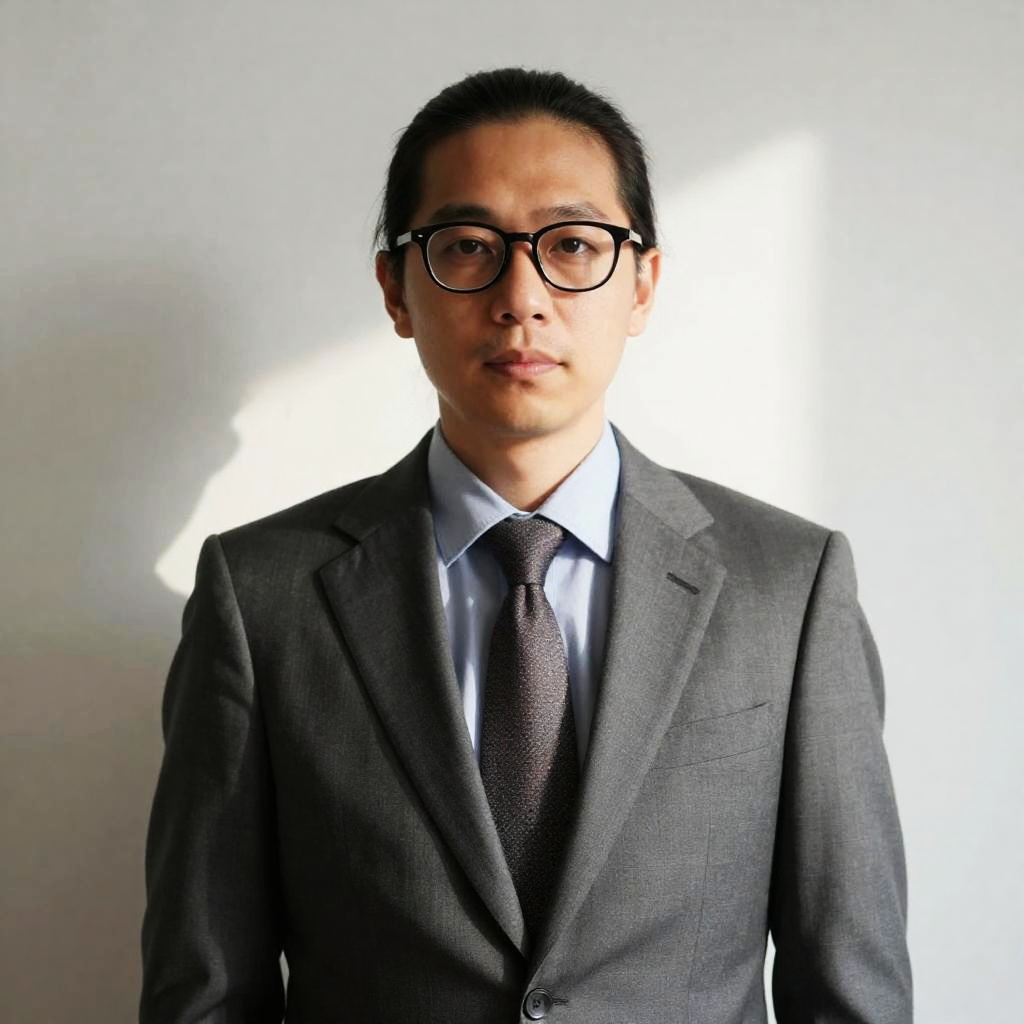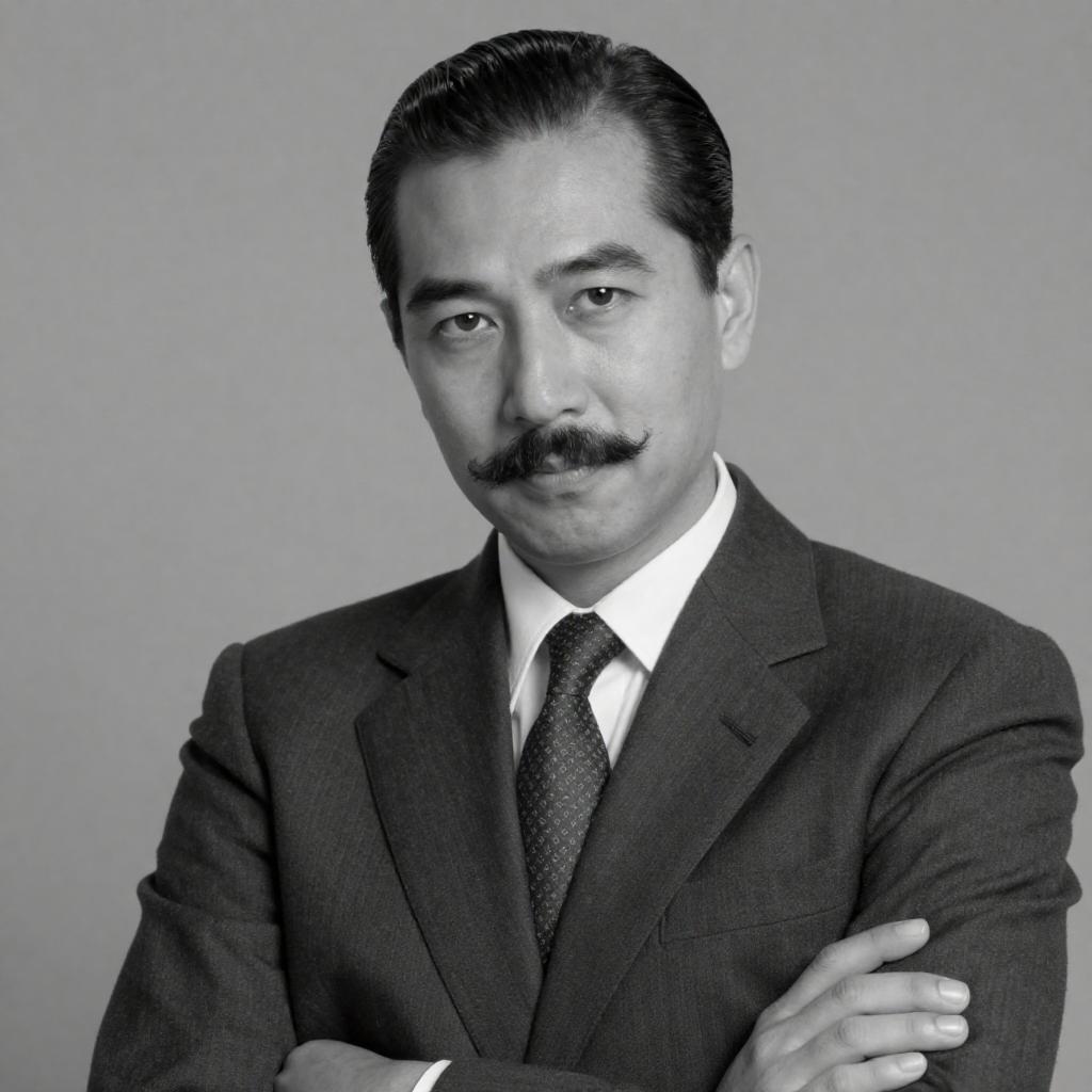 Black and white photograph of a man with slicked-back hair, mustache, and confident expression. He wears a dark suit, white shirt, and patterned tie. Arms crossed, slightly tilted head. Plain background. Upper body focus.