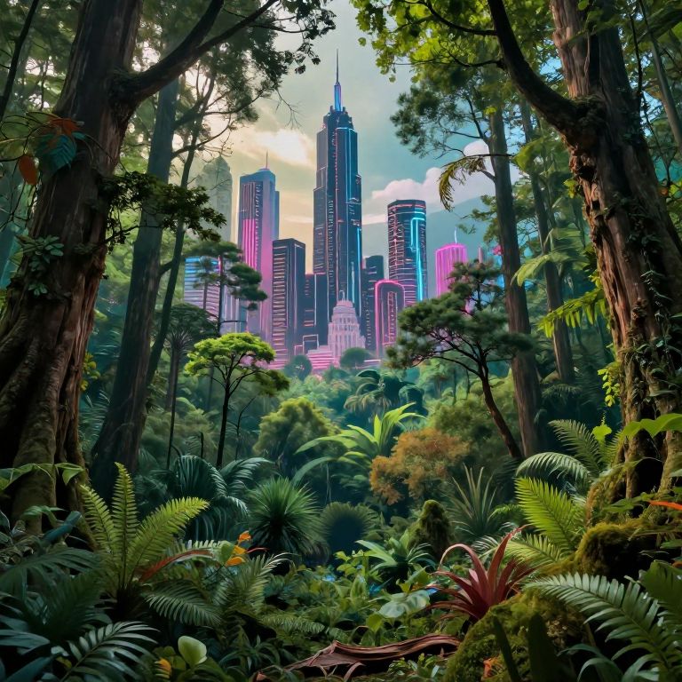 Digital artwork of a vibrant, neon-lit futuristic city skyline peeking through a dense, lush jungle with towering trees and ferns.