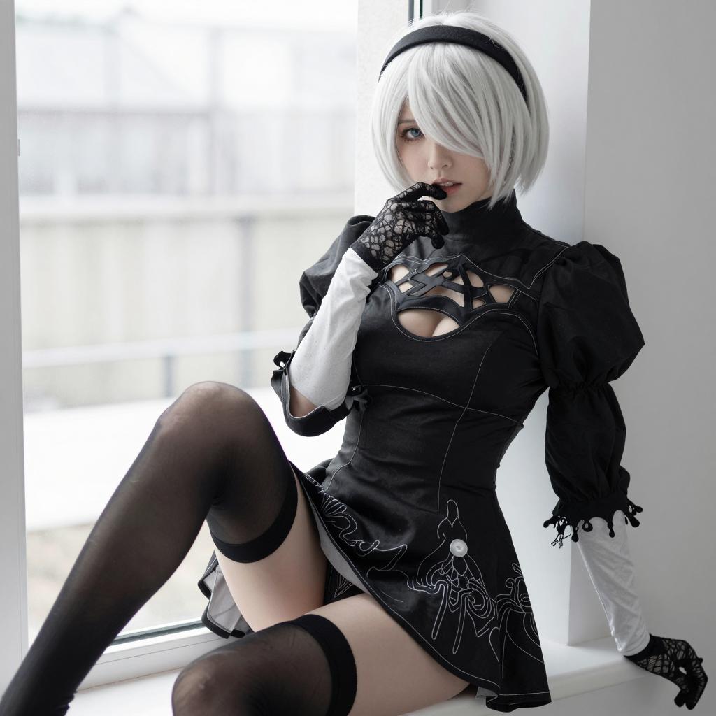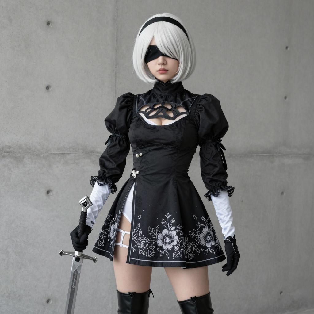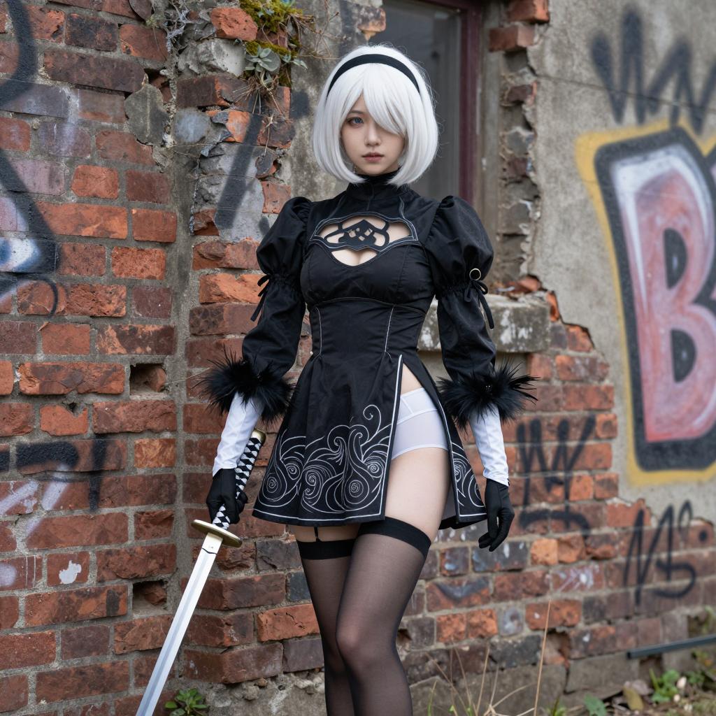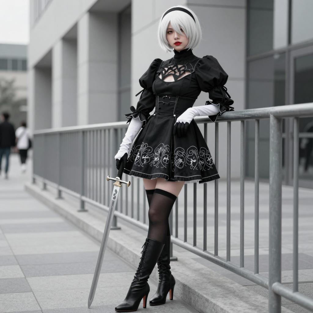 Cosplay photograph of a pale-skinned female with white hair in double buns, wearing a black, gothic, frilled dress with sheer sleeves and black knee-high socks with lace-up details and black shoes. She holds a white, patterned parasol in her right hand. Her left hand rests on her hip. Her facial expression is neutral. The background includes a gray, industrial setting with cables and a wall. She stands on a stone surface. One black strap is visible on her left thigh.