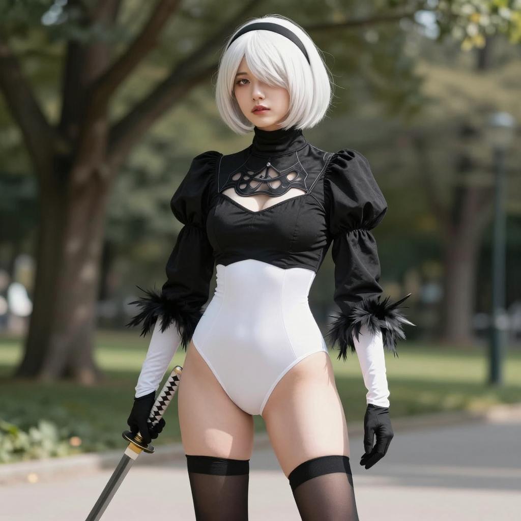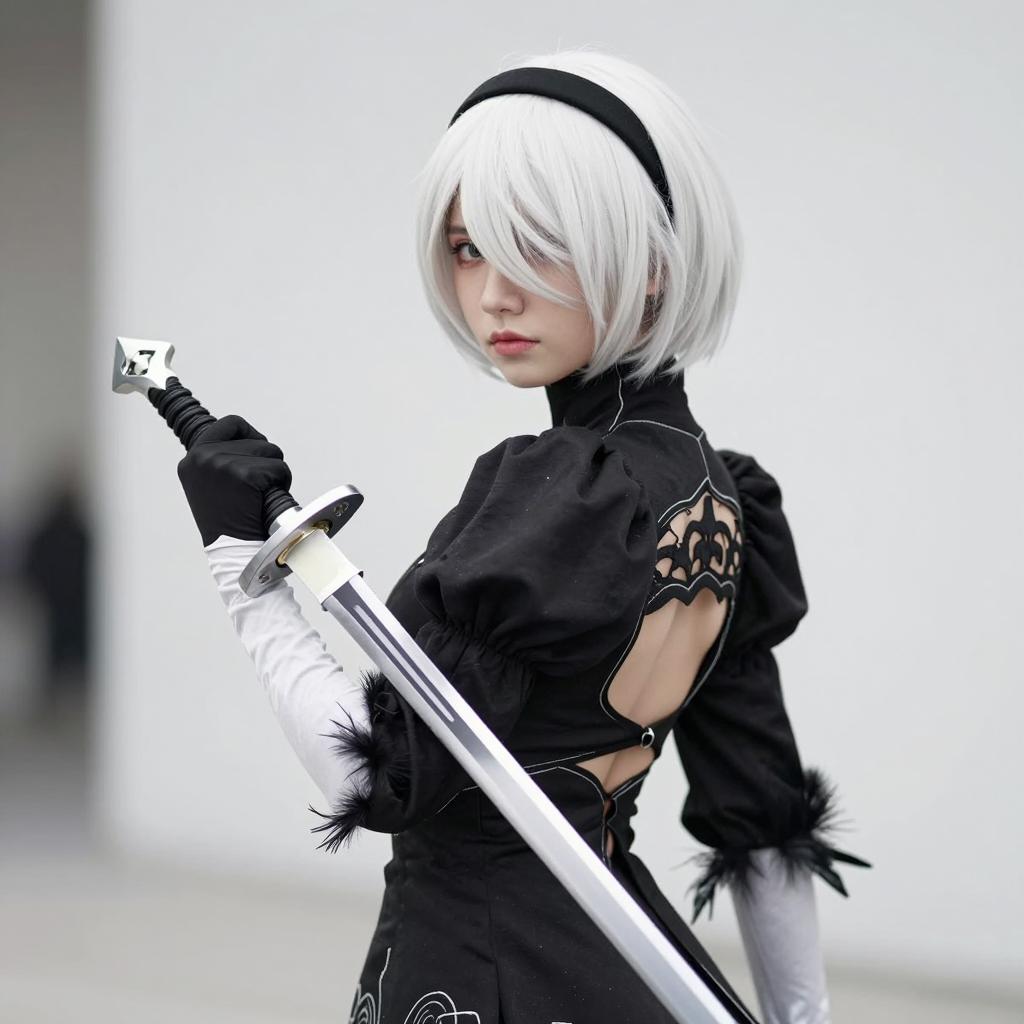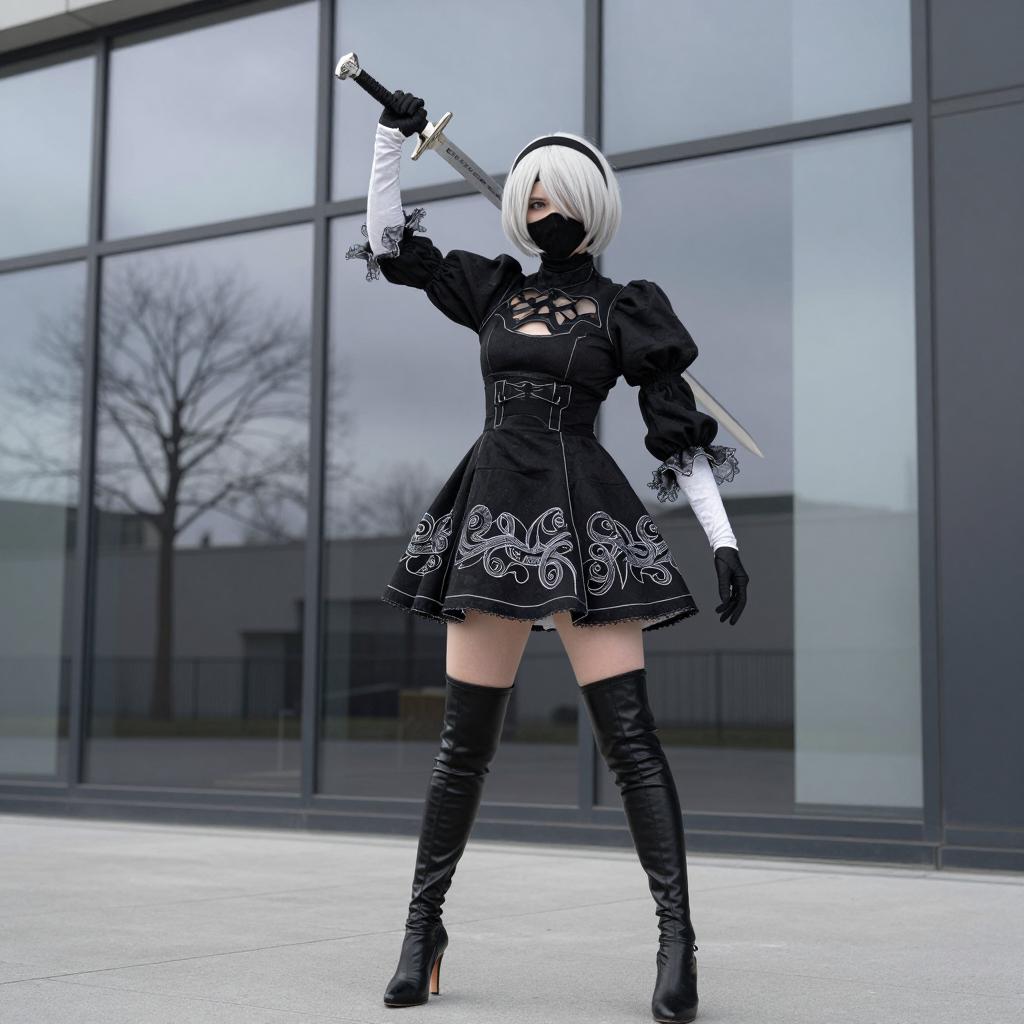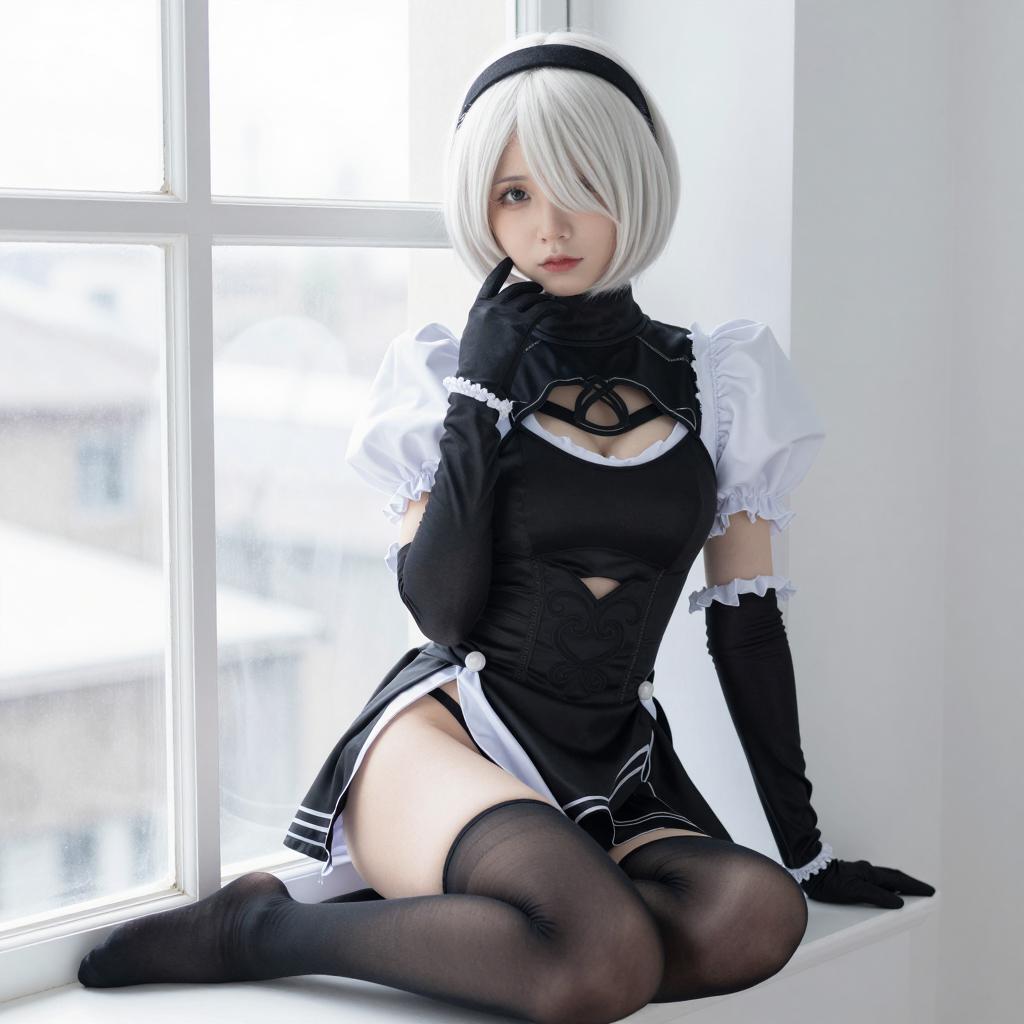 Cosplay photograph of a pale-skinned female with white hair in double buns, wearing a black, gothic, frilled dress with sheer sleeves and black knee-high socks with lace-up details and black shoes. She holds a white, patterned parasol in her right hand. Her left hand rests on her hip. Her facial expression is neutral. The background includes a gray, industrial setting with cables and a wall. She stands on a stone surface. One black strap is visible on her left thigh.