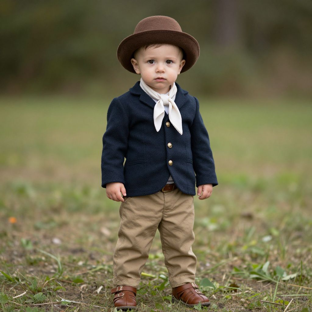 George washington toddler, solo, hat, male focus, standing, 1boy, full body, brown headwear, sandals, closed mouth, ascot, looking at viewer, realistic, brown footwear, long sleeves, jacket
