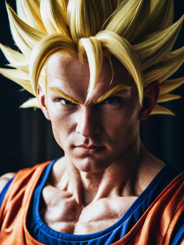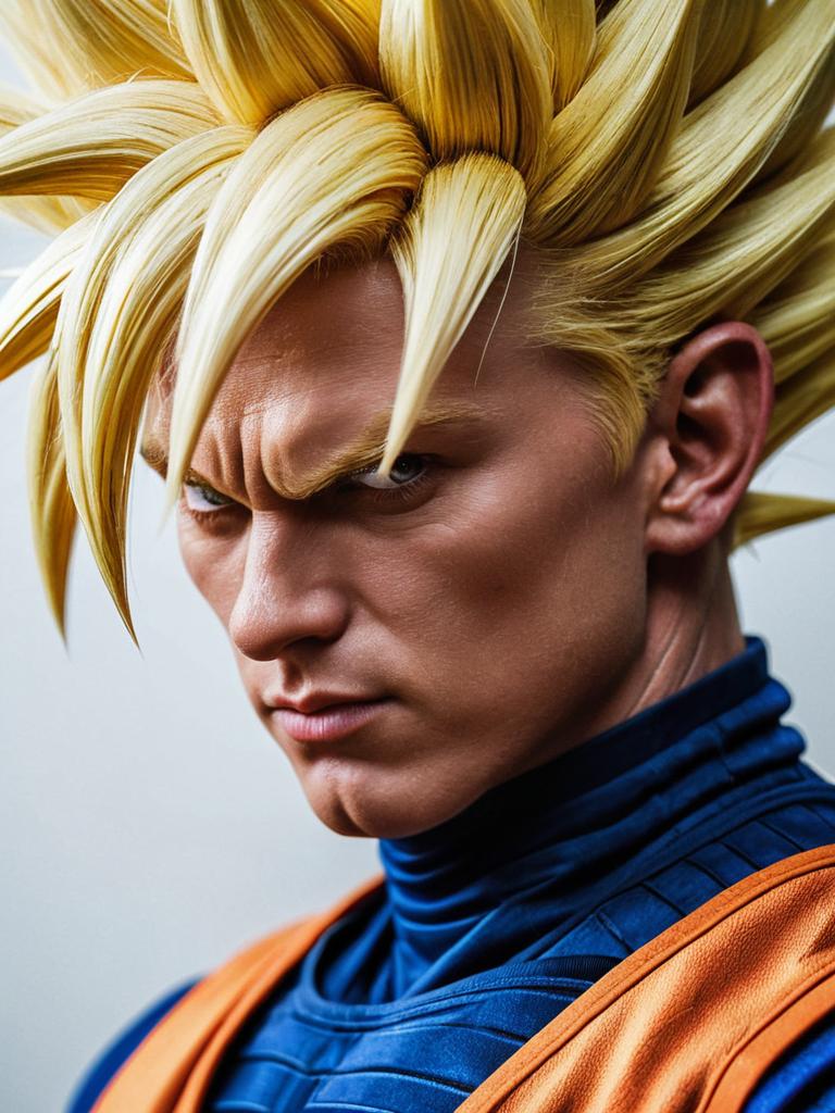 Man in Dragon Ball Super Saiyan costume, photorealistic close-up headshot