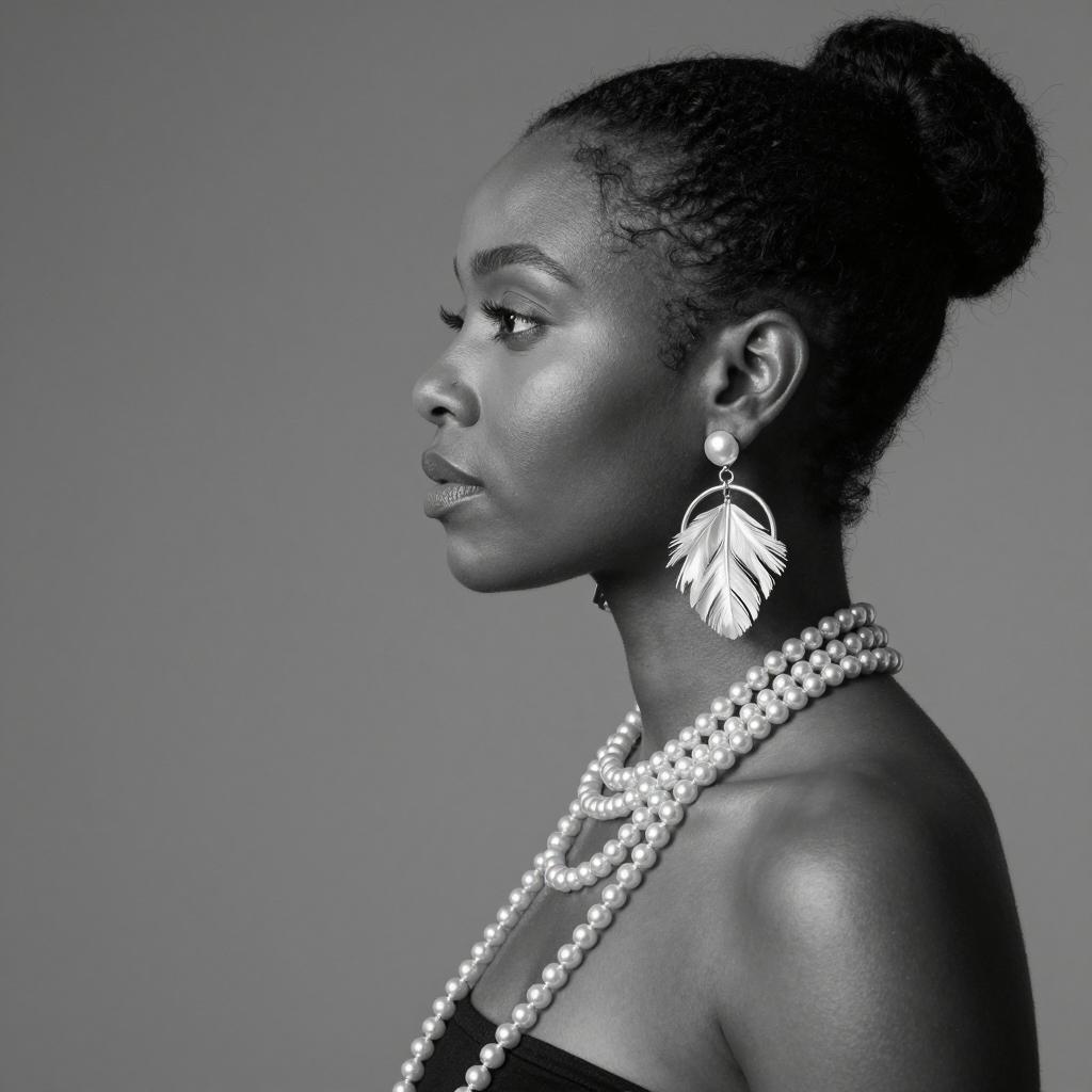 Photograph of a dark-skinned woman with braided hair in an updo, adorned with gold jewelry, including earrings, a necklace, and a headpiece. She wears a black beaded top and looks to the side with a calm expression. Beige ured background.