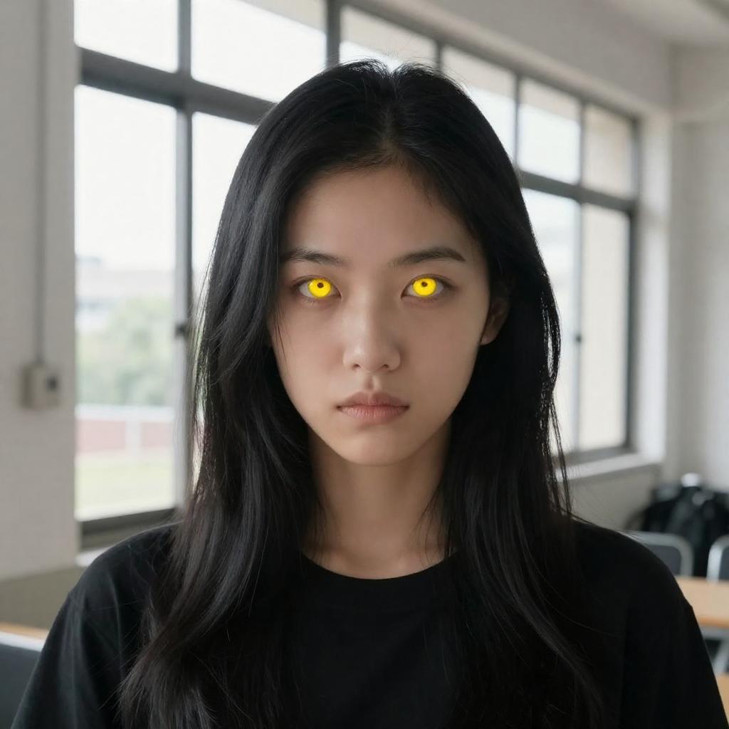 Photograph of a person with long black hair, yellow glowing eyes, and a serious expression. They wear a black shirt. Background: large window with white curtains, black cable hanging, and blurred objects. Bright daylight.