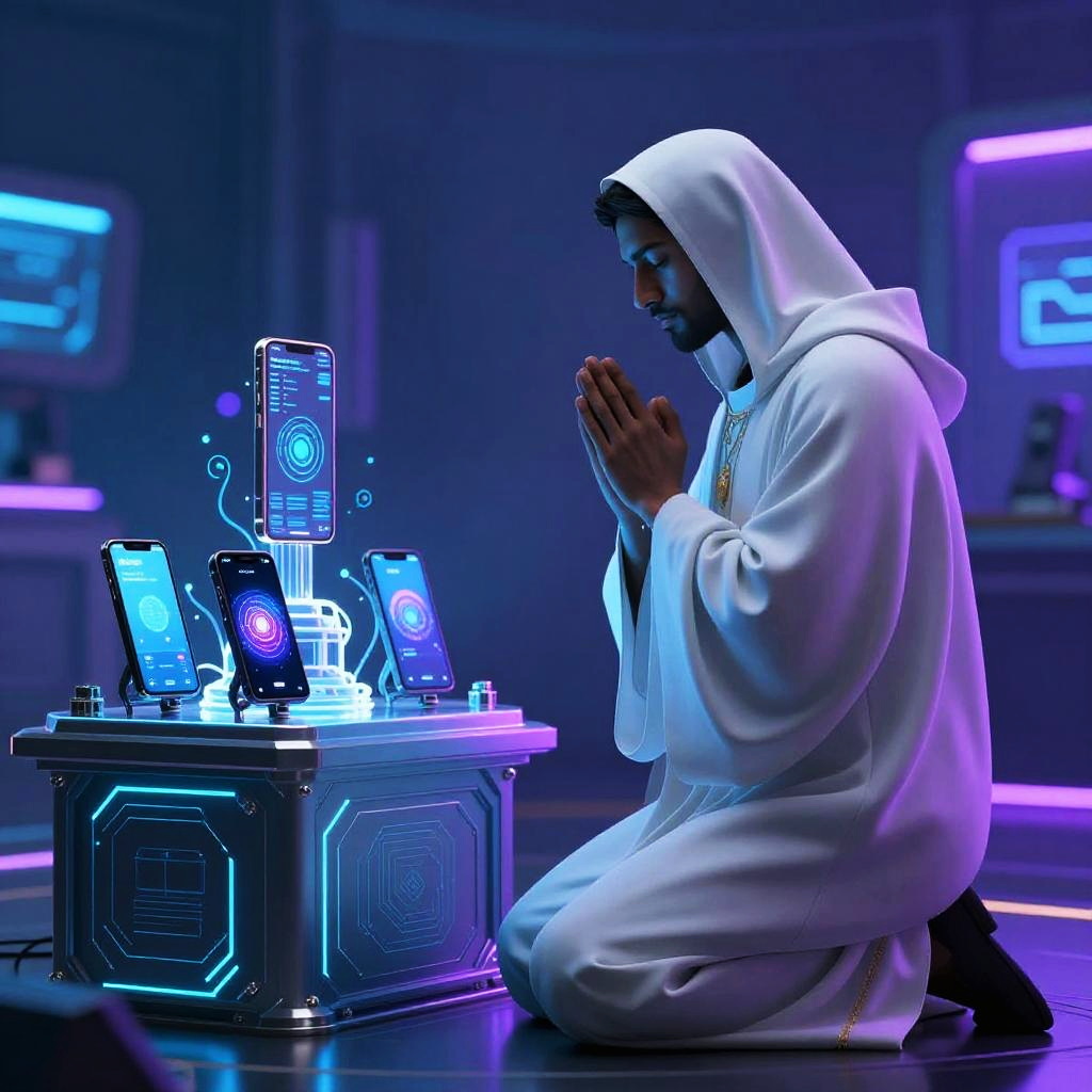 Prayer for technology, a mystical figure in a high-tech robe kneeling before an altar of glowing smartphones and AI elements, ambient cyberpunk lighting with neon blue and purple hues, representing a ritualistic blend of faith and innovation.
