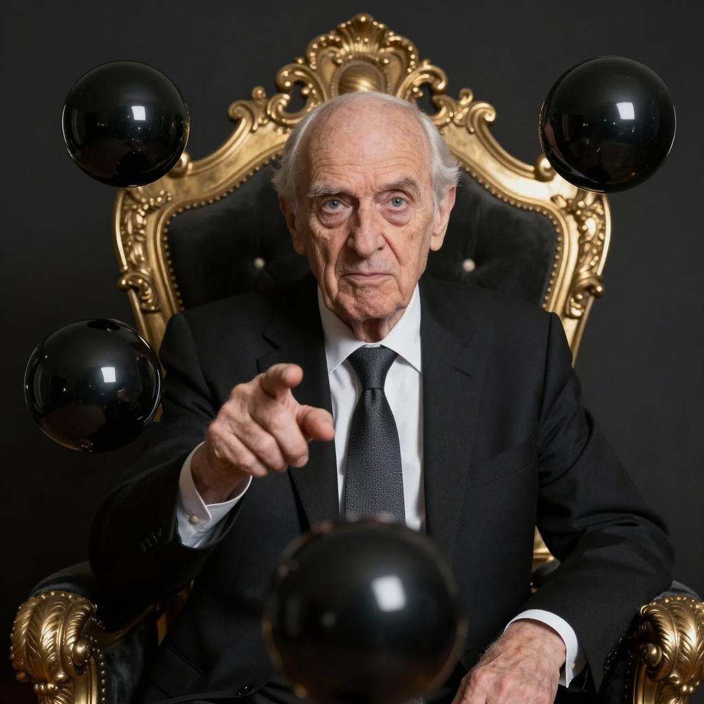 Old man in black suit and tie, bald, intense expression, pointing at black reflective balls, throne with gold accents in background, three balls floating above, one in foreground, dark background.