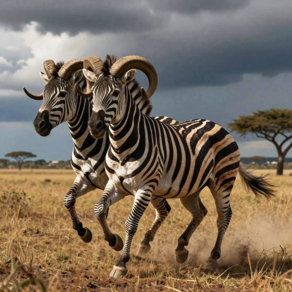 Combine two animals to create a new one, mixing the fierce horns of a ram with the sleek, striped coat of a zebra, charging across a vast savannah under stormy clouds, dynamic motion, vibrant colors and detailed textures, epic wildlife mashup artwork.