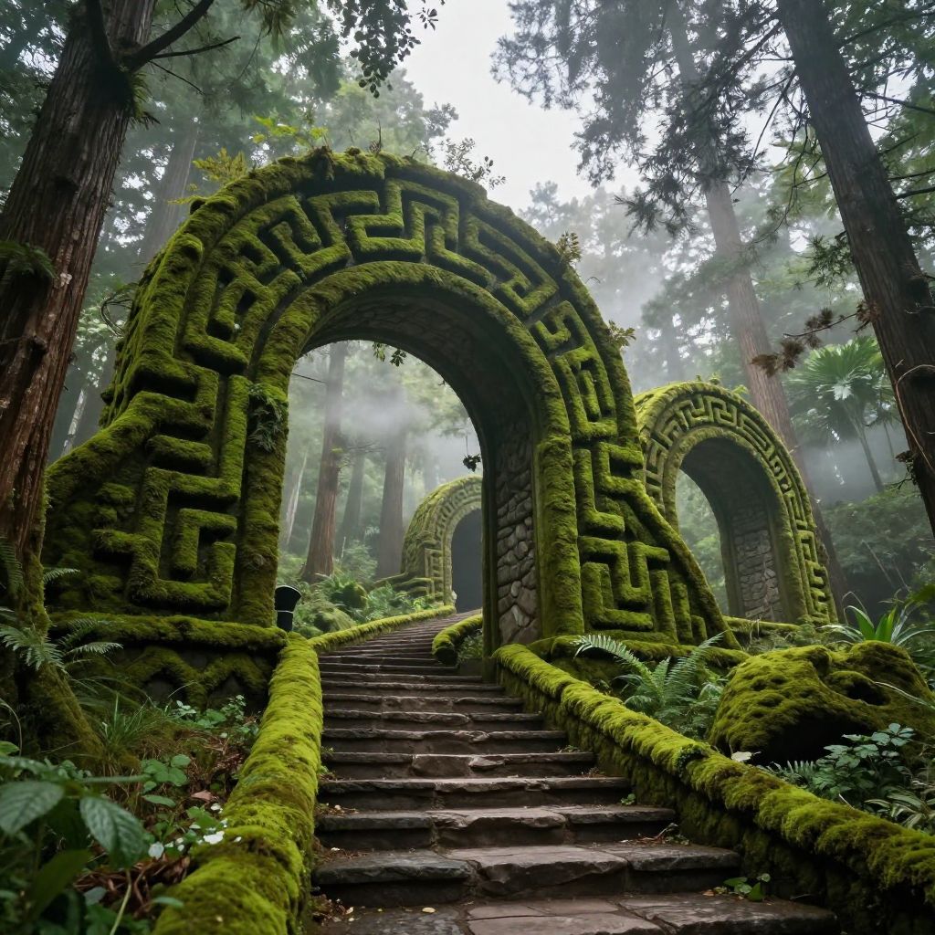A fantastical forest scene featuring a winding stone stairway leading to large, ornate archways covered in lush green moss and shaped like maze patterns. Towering trees surround the structure, and mist floats through the area, creating an ethereal and magical atmosphere under a bright, cloudy sky.