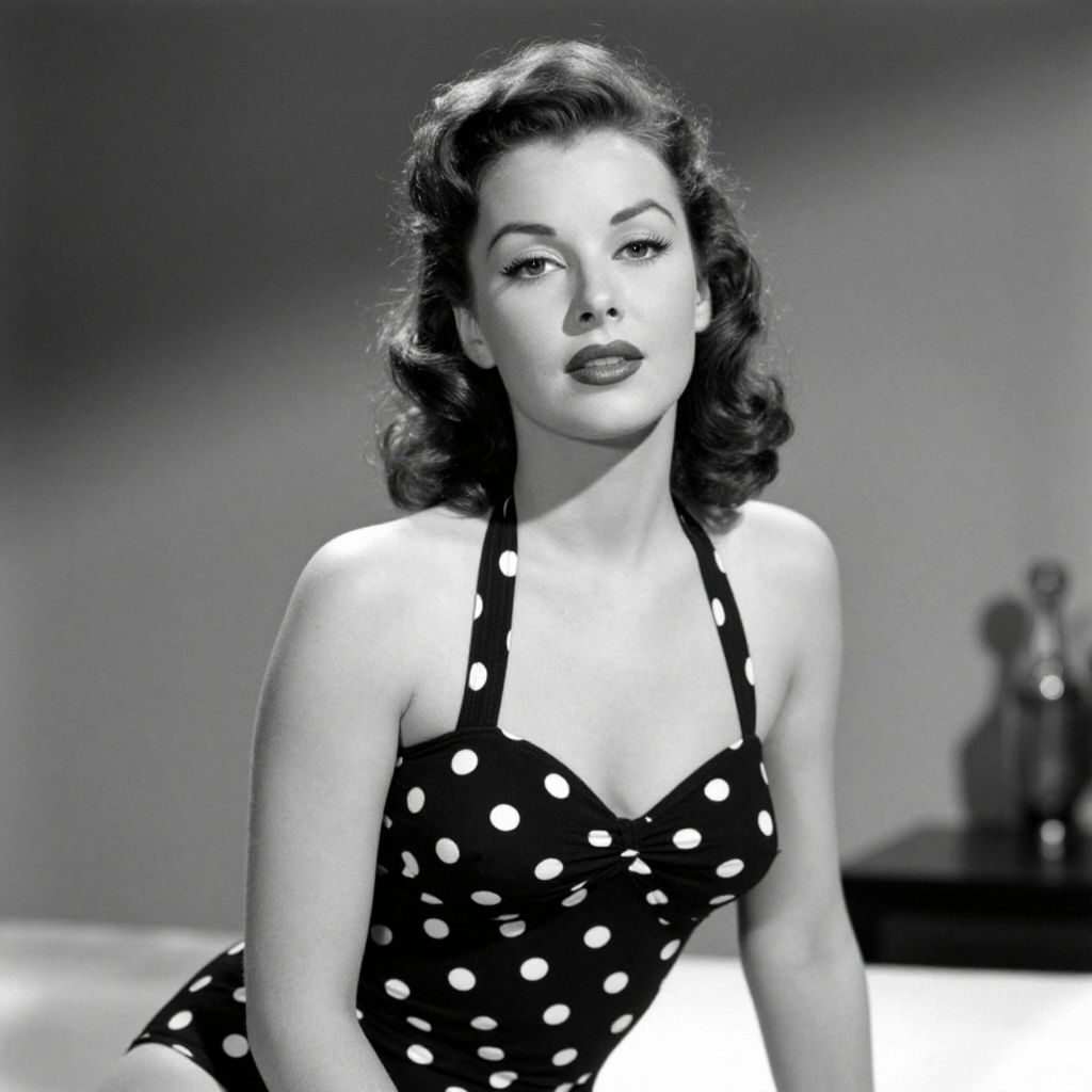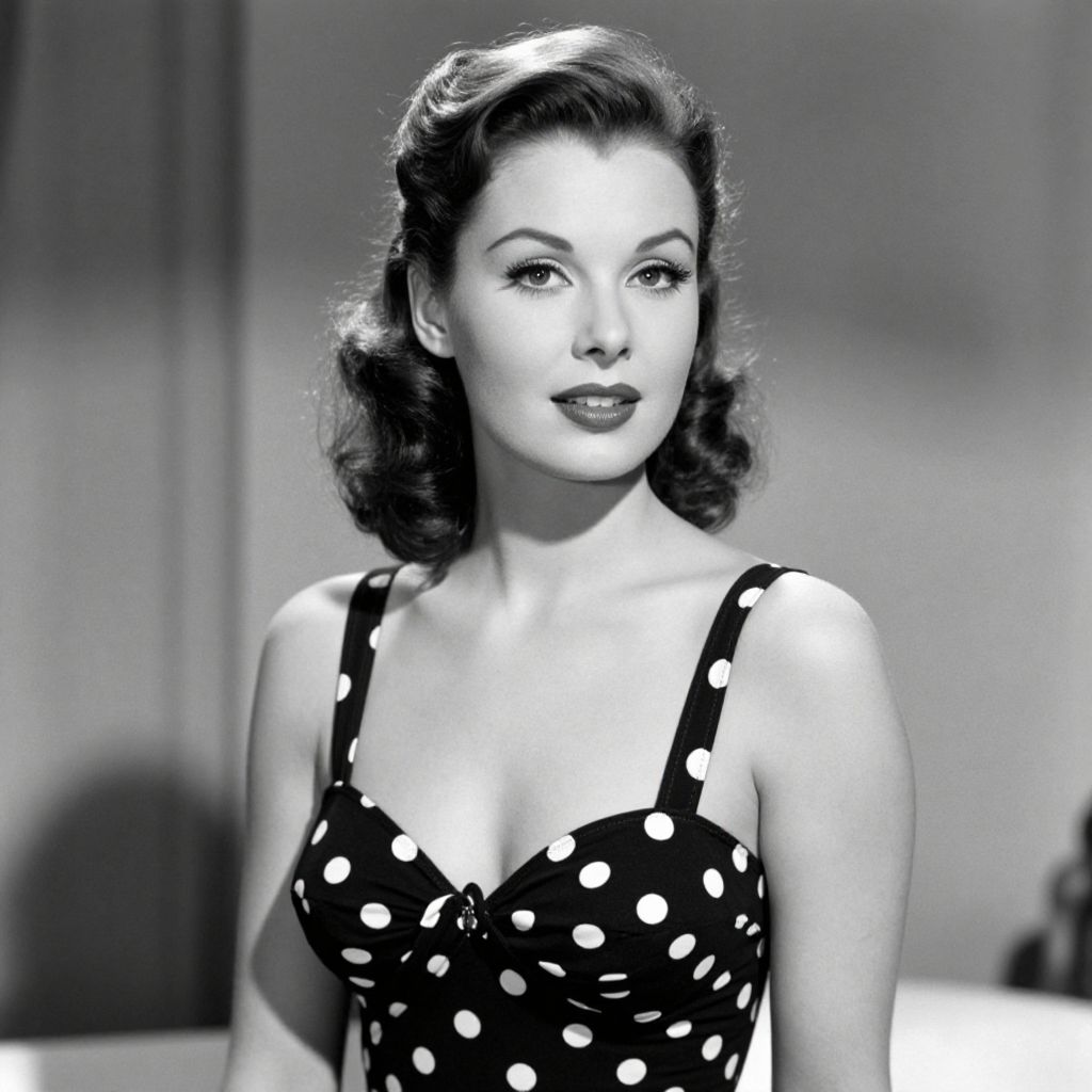 A vintage black-and-white photograph captures a radiant woman in a polka-dot swimsuit, embodying the classic Hollywood glamour of the 1950s with dramatic lighting and timeless elegance, reminiscent of the iconic style associated with Ava Gardner.