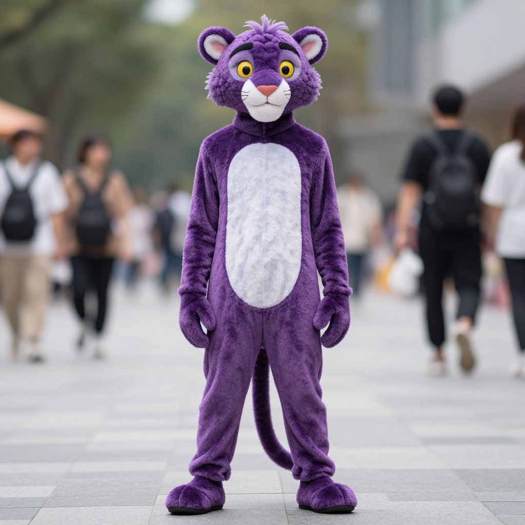 Photograph of a person wearing a purple and white furry lion costume with yellow eyes, standing in a busy urban plaza. Blurred pedestrians in the background