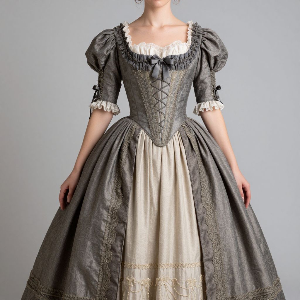 Elegant woman showcasing a Victorian Rococo-inspired dress with a corseted bodice, puffed sleeves, and a voluminous skirt, embodying vintage fashion elegance.