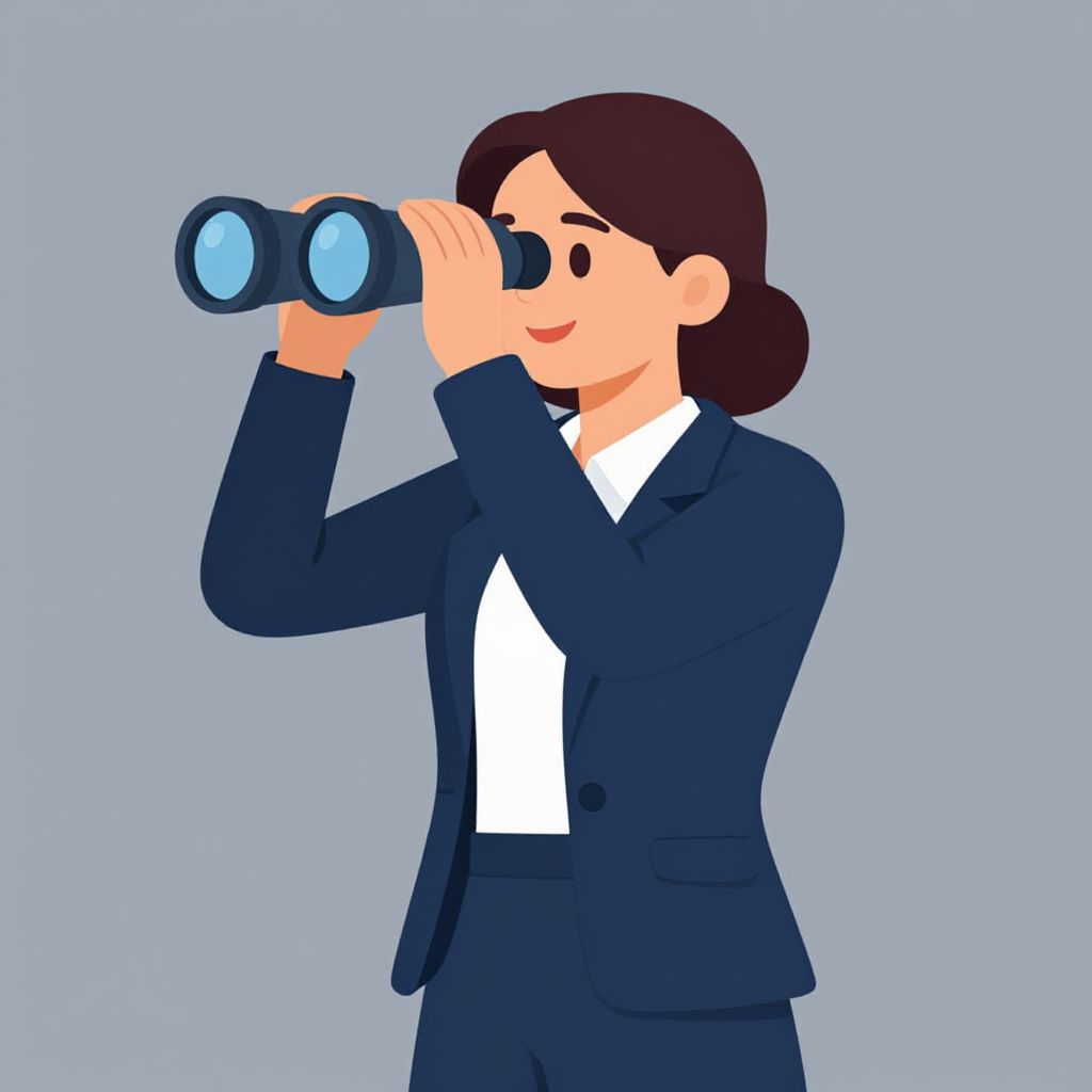 Digital illustration of a smiling woman in a navy suit, white shirt, holding black binoculars, looking through them against a light blue background.