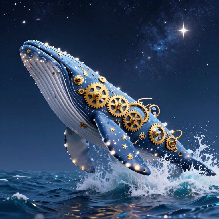 Digital art of a blue whale with golden gears and stars, emerging from dark blue ocean, under a starry night sky.