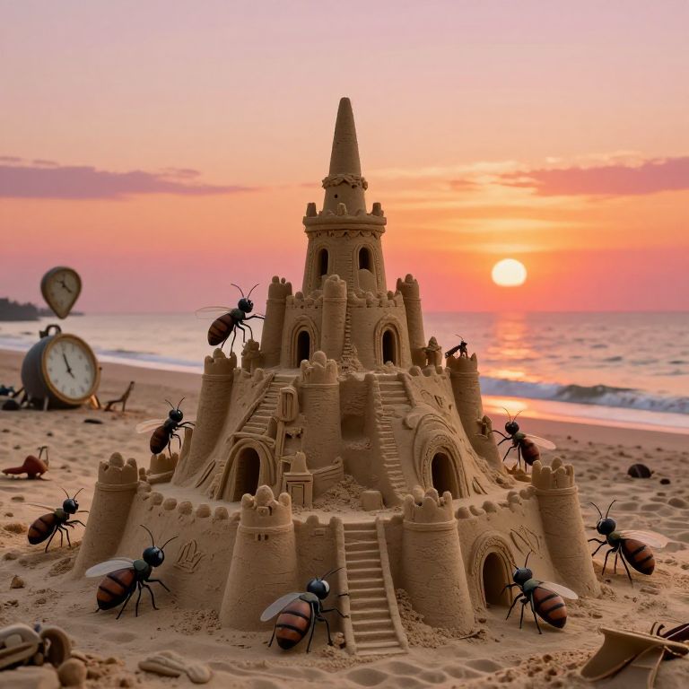 Giant ants carefully sculpt sandcastles using impossibly delicate swiss-army-knife mandibles on a beach where gravity pulls sideways.