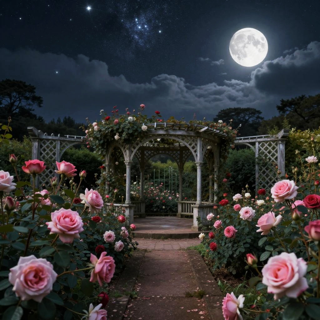 Photograph of a moonlit garden with a white wooden gazebo, surrounded by pink and red roses, under a starry sky. Full moon illumin