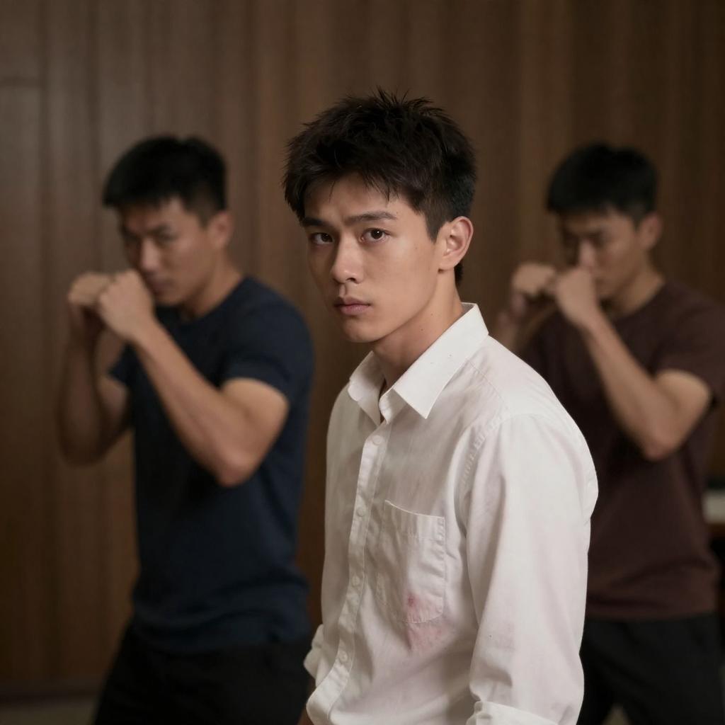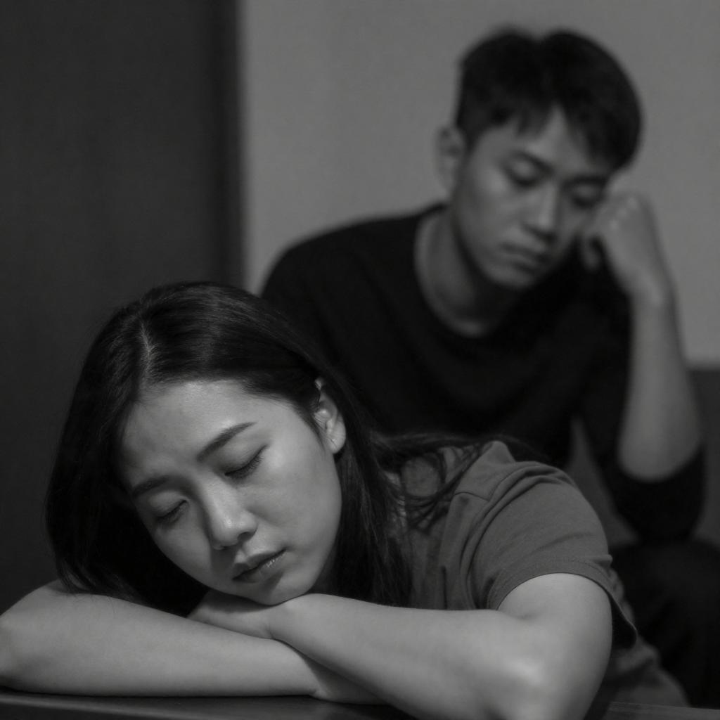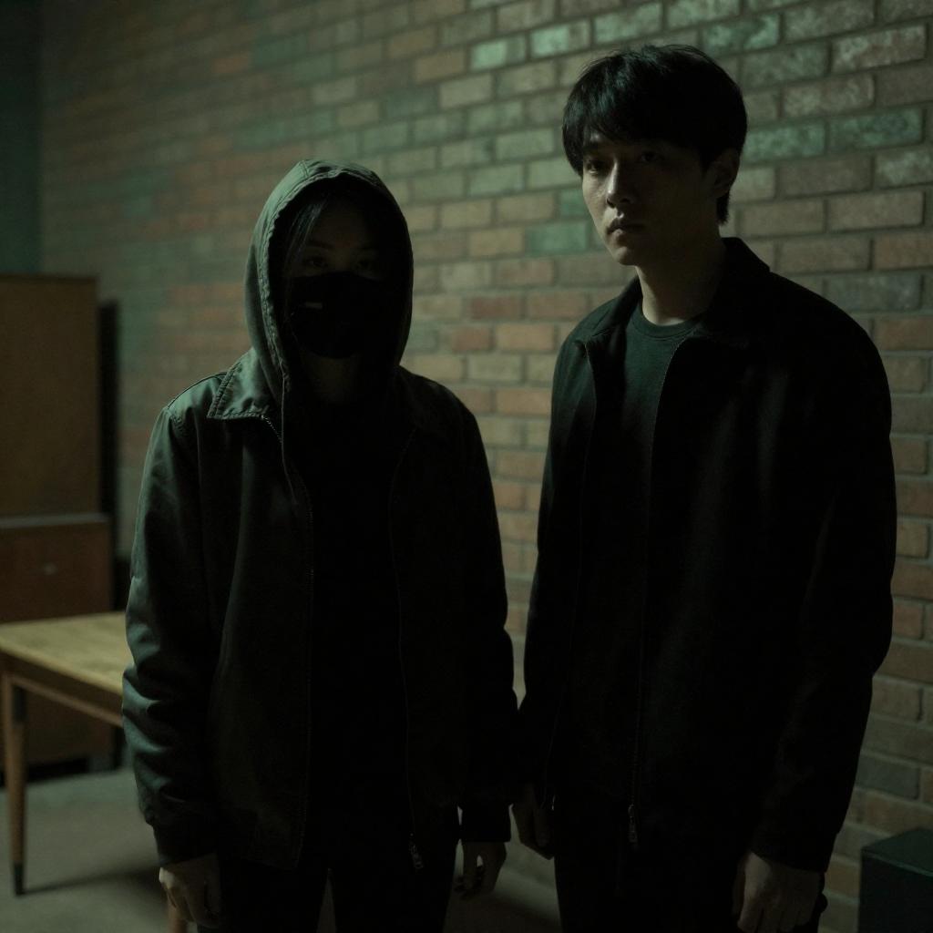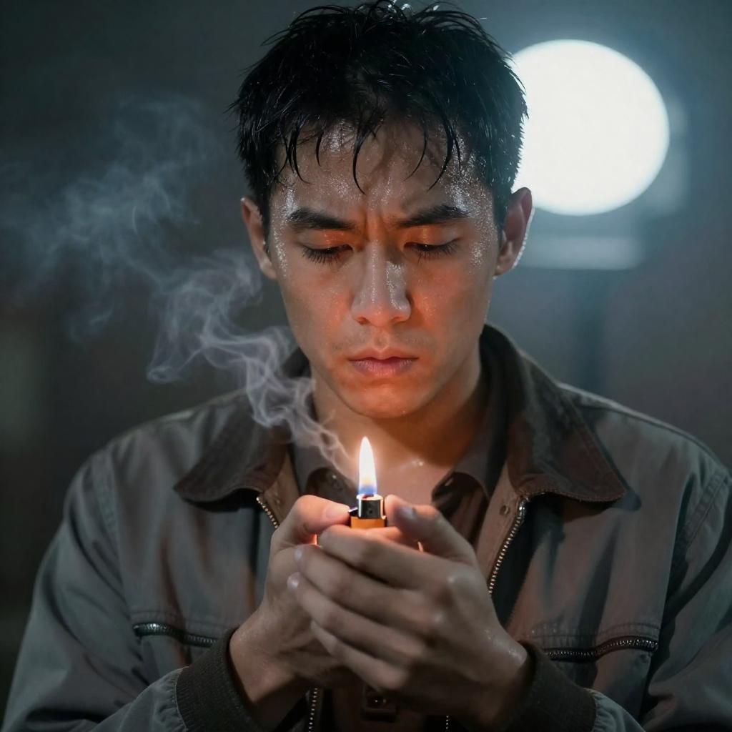 Photograph of two East Asian men in a dark, green-lit corridor. Man in foreground, eyes closed, holding cigarette; man in background, serious expression, dark hair, partially obscured. Both wear dark clothing. Man in background leans against man in foreground.