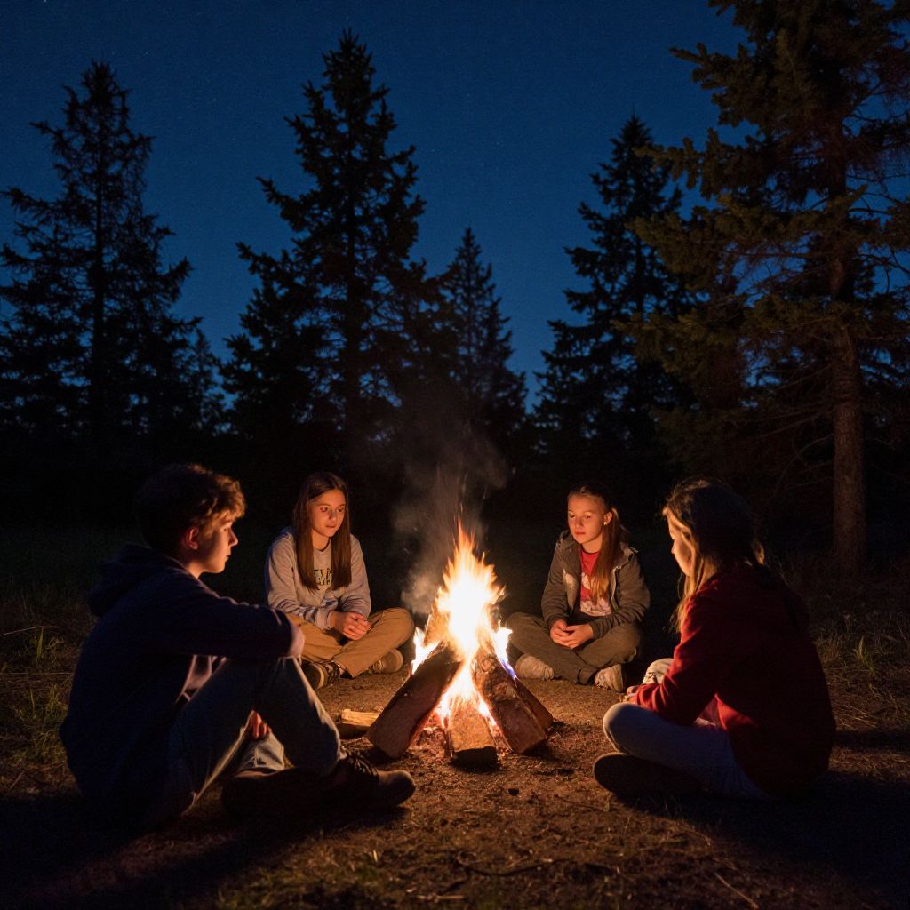 Four children gather around a crackling campfire, sharing stories under a starry night sky amidst towering evergreen trees.
