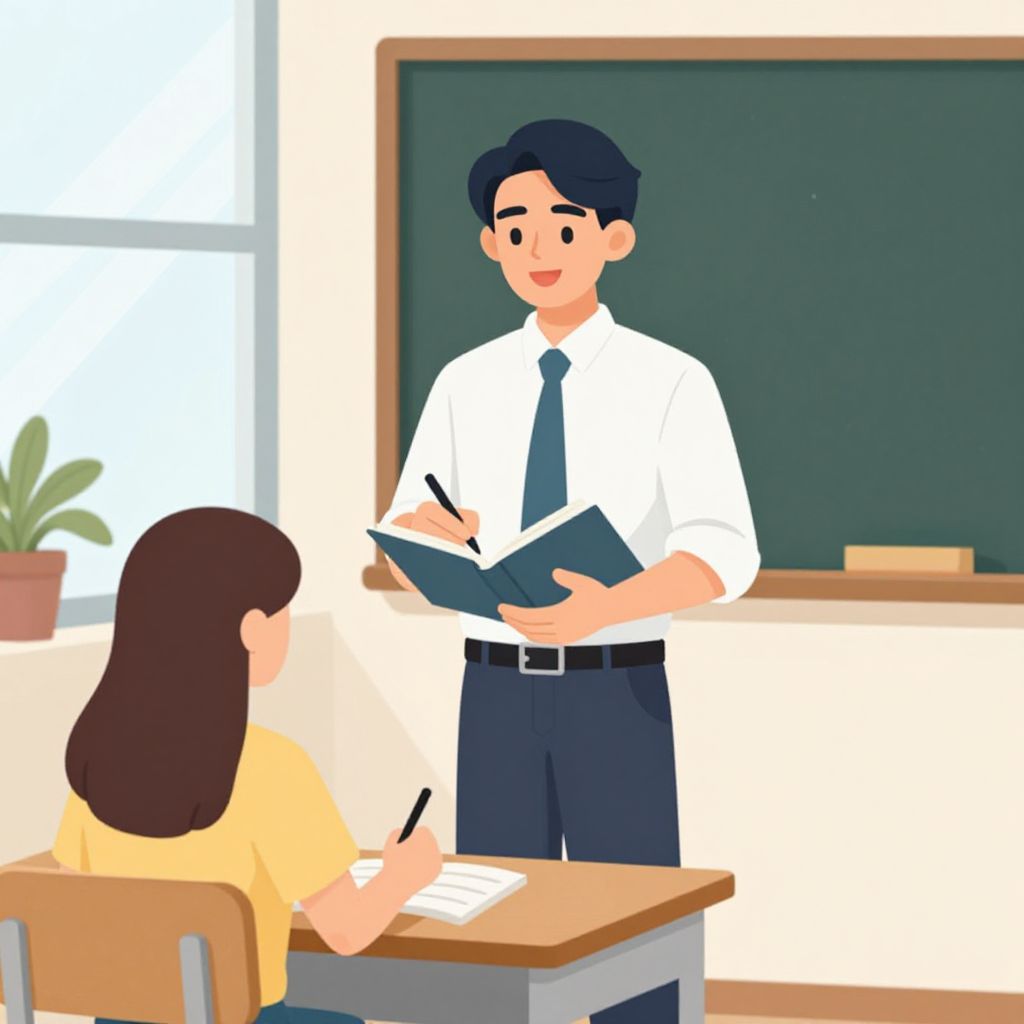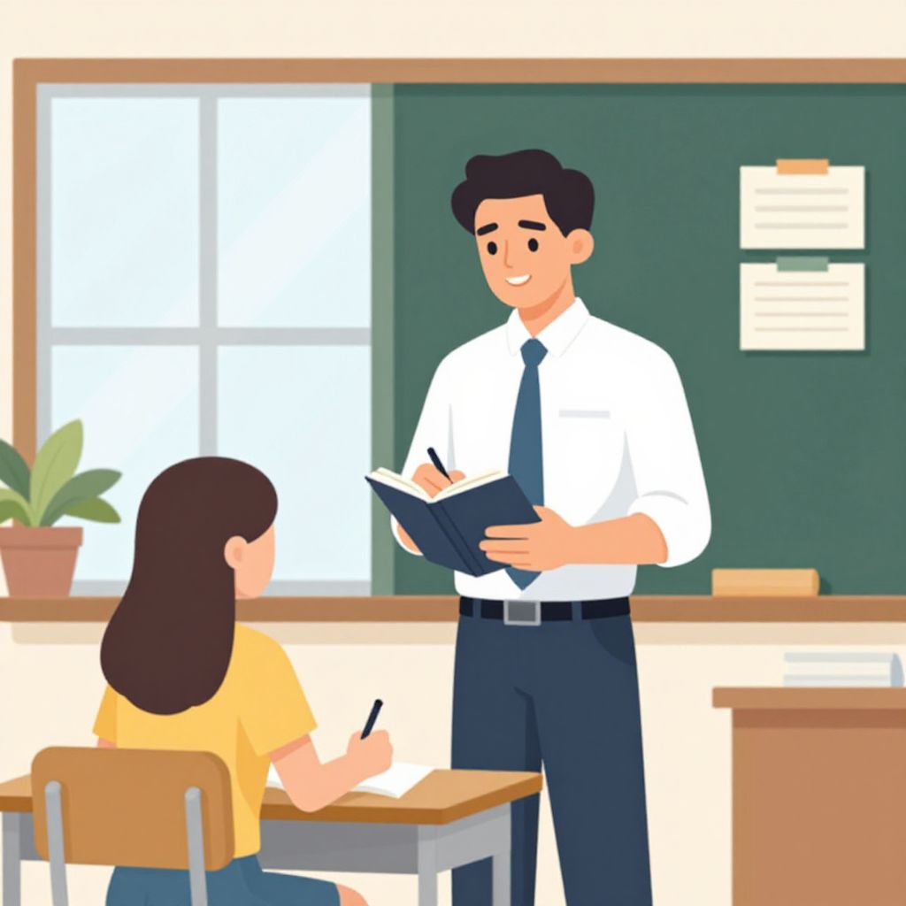 Illustration of a smiling male teacher with black hair, white shirt, and black tie, holding a notebook, standing in front of a seated female student