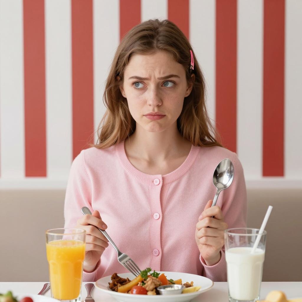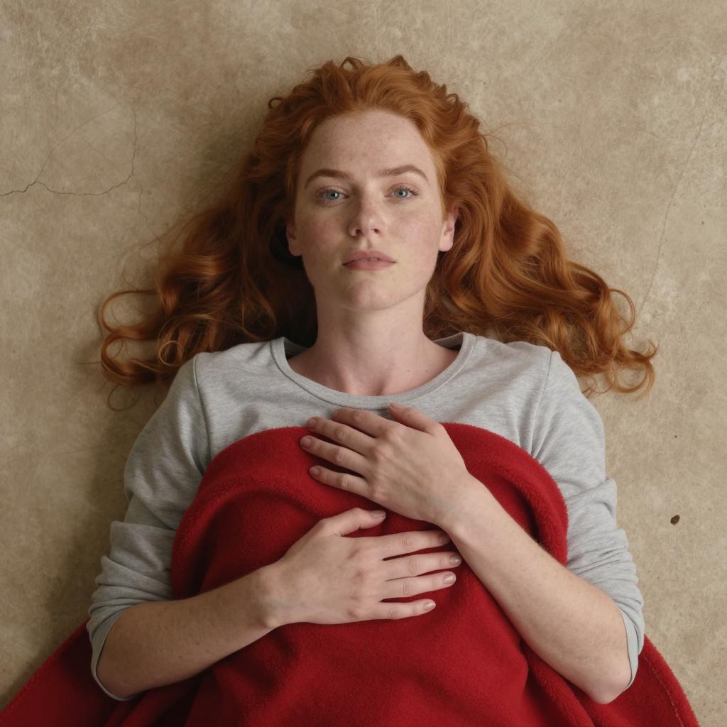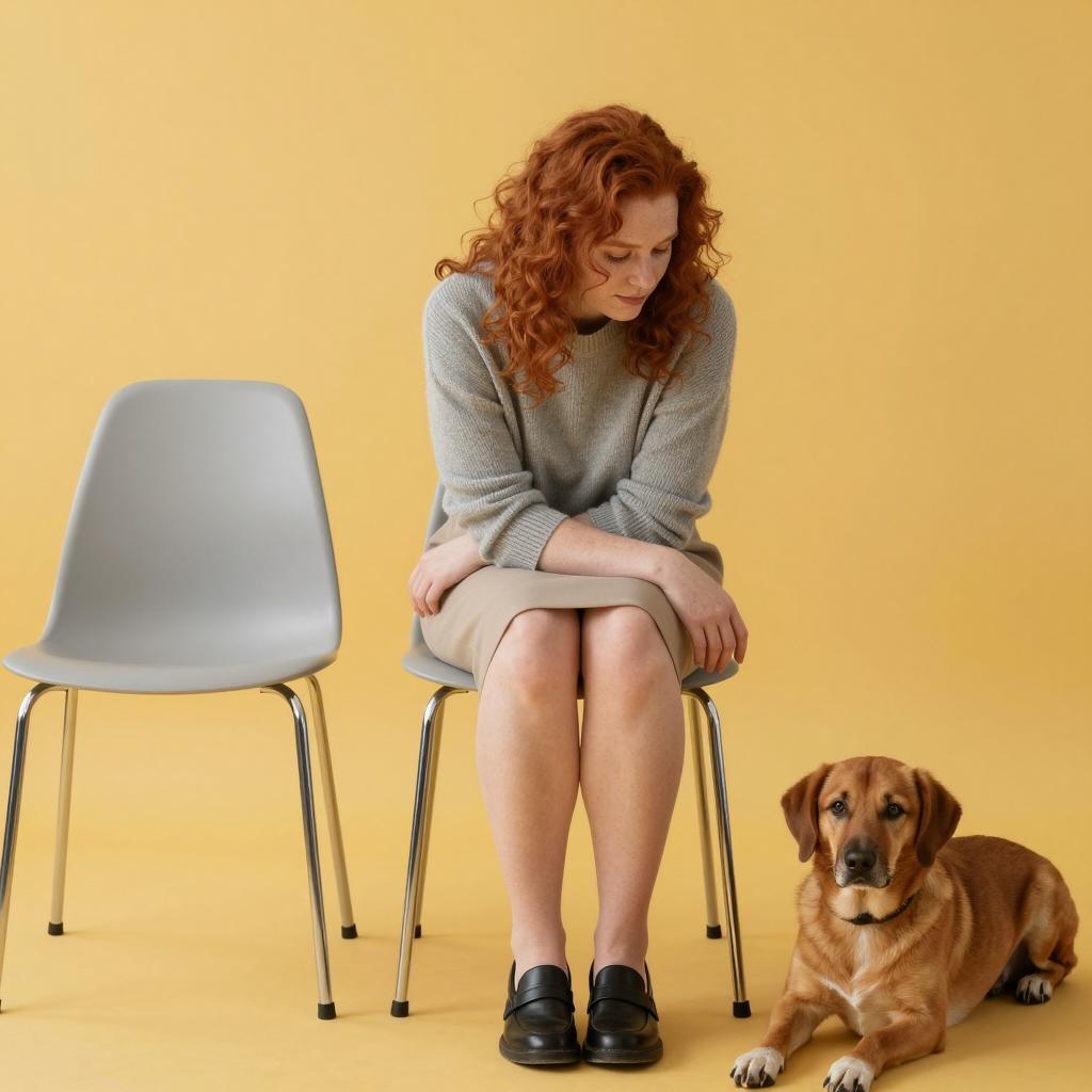 Red-haired woman with fair skin and medium build, wearing a gray sweater, beige skirt, and black shoes, sits on a gray chair, head down, arms resting on knees. Brown dog lies on the floor to her right. Two empty chairs with metal legs are to her left. Background is a solid yellow wall.