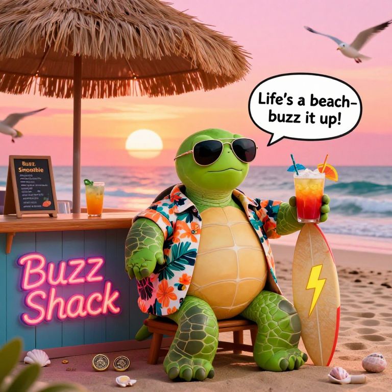 A cool, laid-back turtle sits at a beachside juice bar under a big straw umbrella, with the sun setting behind him in vibrant pinks and oranges, The turtle, with a chill expression and a pair of aviator sunglasses perched on his nose, wears a floral Hawaiian shirt that’s a bit oversized, its sleeves draping over his flippers, One flipper holds a tropical drink topped with a mini lightning bolt skewer, symbolizing the buzz emblem, while the other rests on a surfboard propped up beside him, The juice bar’s sign reads “Buzz Shack” in bright, neon lettering, and around the bar, small decorative items hint at a love for buzz: seashells shaped like tiny buzz coins, surfboards painted with lightning bolts, and a menu board offering a “Buzz Blast Smoothie” special, Above the turtle’s head is a speech bubble that reads, “Life’s a beach—buzz it up!” Behind him, gentle waves roll in, and a few seagulls hover in the sky, adding to the easy-going beach vibe, The whole scene exudes relaxed island energy, making it clear that for this turtle, the buzz life is all about chilling and enjoying the good vibes