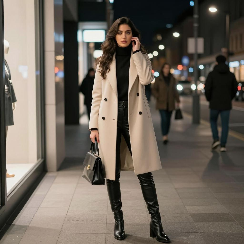 Photograph of a woman in a city setting. She wears a beige turtleneck sweater, oversized beige hat, long beige coat, beige thigh-high boots, and carries a beige handbag. She has dark sunglasses and long brown hair. Her body is slightly angled to the left. The background includes glass windows and metal frames. She stands on a gray paved area with a metal chair to the right.