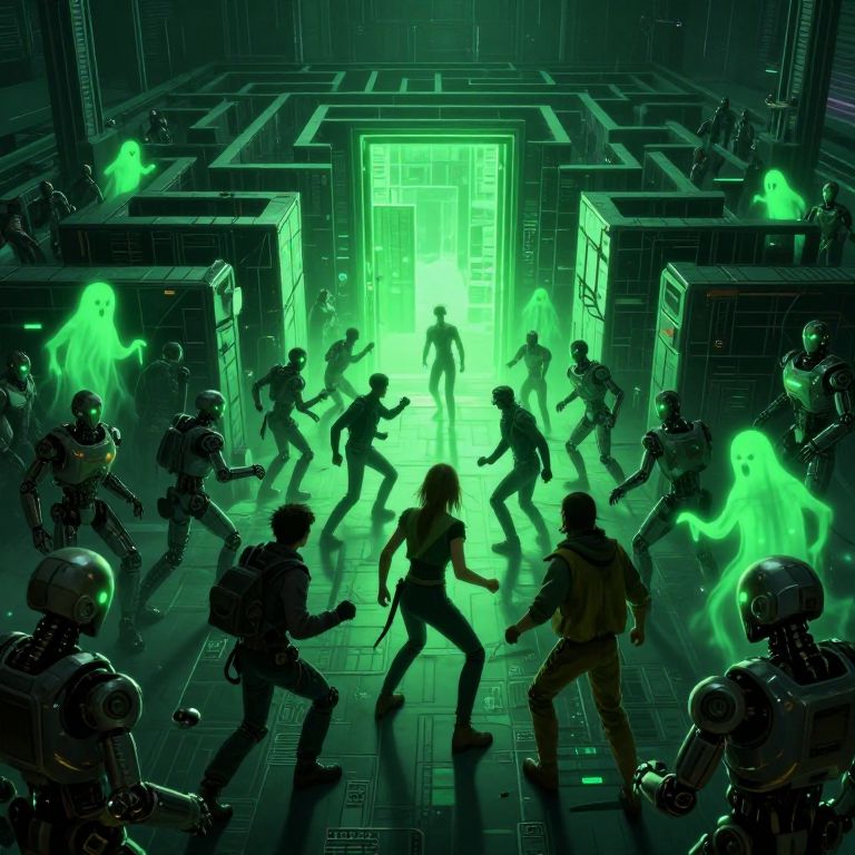 The image depicts a cyberpunk scene with a group of people rioting in a maze-like structure. The maze is filled with green, glowing ghosts and souls, creating an eerie atmosphere. The people, dressed in futuristic attire, are surrounded by a large crowd of robots with glowing green eyes, adding to the ominous ambiance. The robots are positioned in a grid-like formation, with some standing in the foreground and others in the background, creating a sense of depth. The maze's walls are made of metal and glass, with a large, glowing green door at the center, leading to another dimension. The overall color palette is dominated by shades of green and black, with the green lights contrasting sharply against the dark background. The scene is highly detailed, with intricate textures and shadows, giving it a realistic and immersive feel. The composition is dynamic, with the people and robots interacting in a chaotic yet organized manner, creating a sense of tension and anticipation.