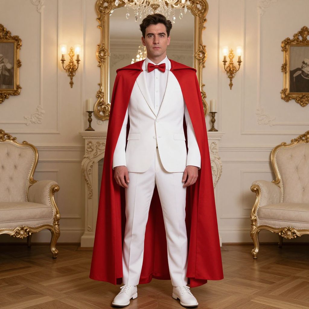 Man Gala Attire Costume, dressed in a white suit and red cape standing in a room