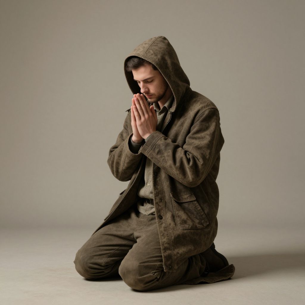 The image depicts a man in a kneeling position, deeply engaged in prayer. He is dressed in a rugged, full-length coat with a hood, which appears to be made of a thick, durable material, possibly leather or canvas. The coat is worn over a simple, long-sleeved shirt and pants, suggesting a practical, utilitarian style. His hands are clasped together in a gesture of supplication, and his posture is one of humility and reverence. The background is a soft, neutral tone with subtle splashes of color, creating a serene and contemplative atmosphere. The overall composition is balanced, with the man centrally positioned and the background elements providing a calm, undistracted space for the viewer to focus on his prayerful state.