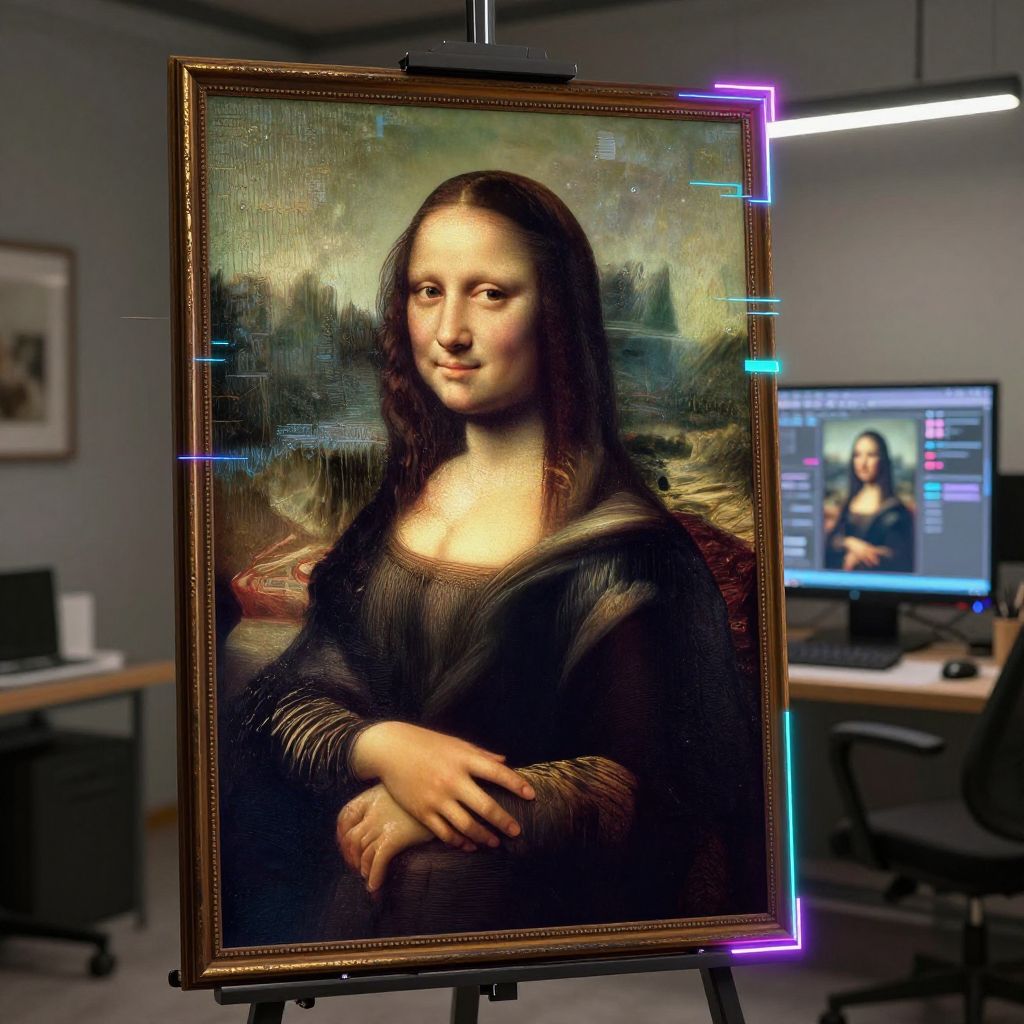 AI modify image visualizing an advanced AI tool retouching a classic painting, blending old art with modern, digital glitch effects, pixelated fragments merging with fine brushwork, bright neon outlines and a high-tech virtual workspace reflecting creative AI manipulation.