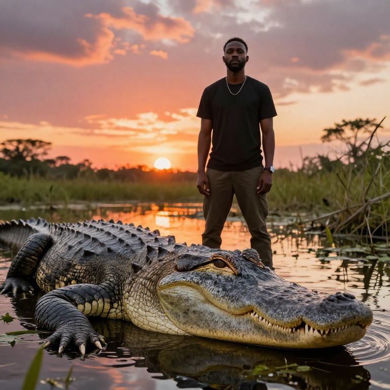 Black guy standing confidently next to a massive alligator in a swamp, vibrant sunset light, detailed textures, cinematic atmosphere, realism