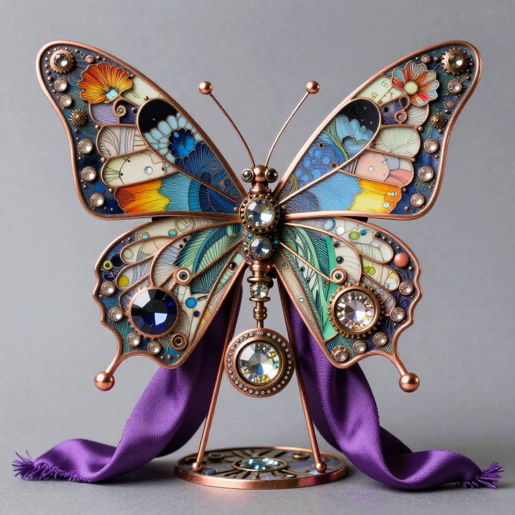 A articulated clockwork stag automaton crafted from burnished brass, stained glass, polished wood, and leather straps, designed by Lindsay Blondell and Yve Laris Cohen, with intricate linework, hyper-detailed textures, muted tones, super sharp focus, low contrast, and a matte finish.