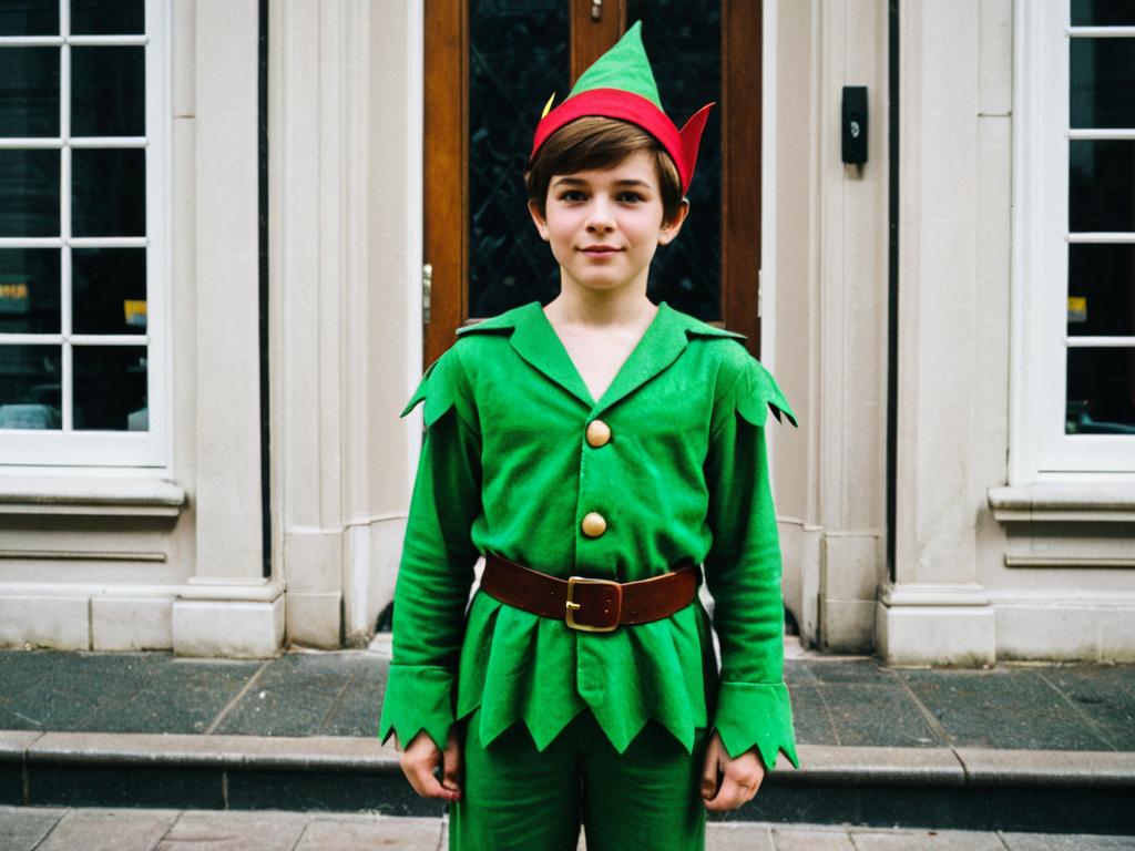 Peter Pan Fancy Dress face swap, boy in green elf costume posing for a picture