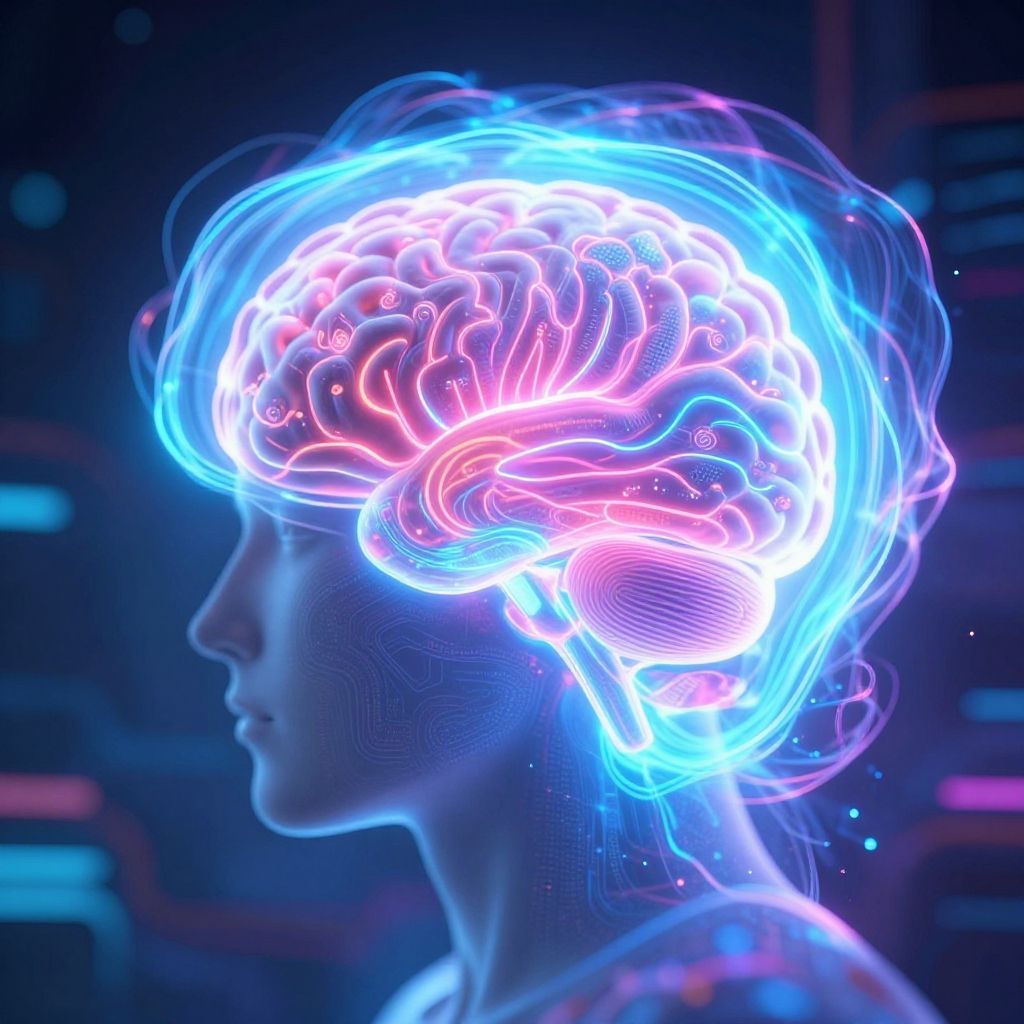 Digital artwork of a glowing, neon-blue and pink human brain profile against a dark, futuristic background. The brain's intricate, luminous patterns contrast with