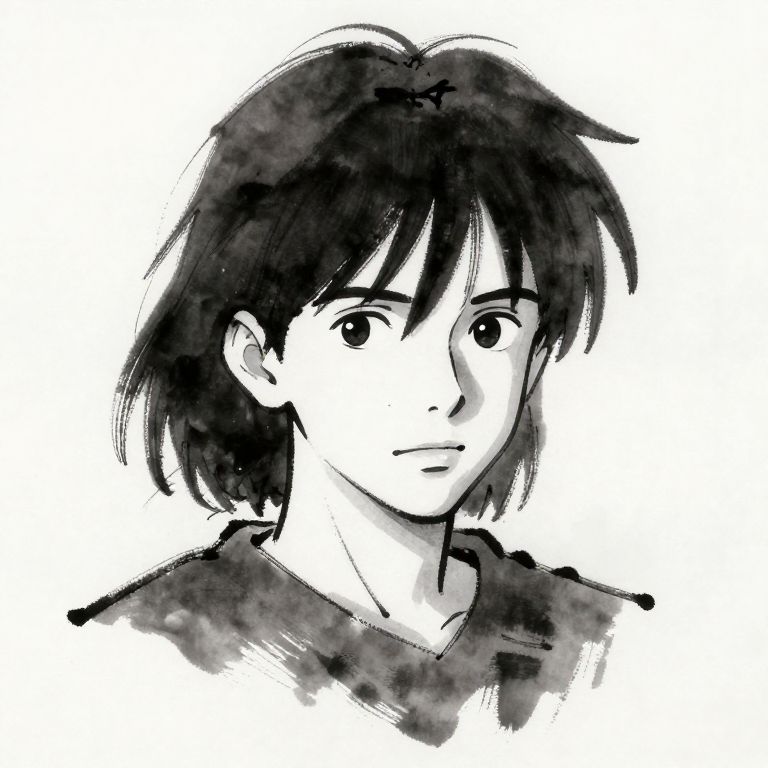 "Skeumorphism Male, young, head portrait, splash-ink style, imitation Miyazaki brush strokes, medium length hair,"